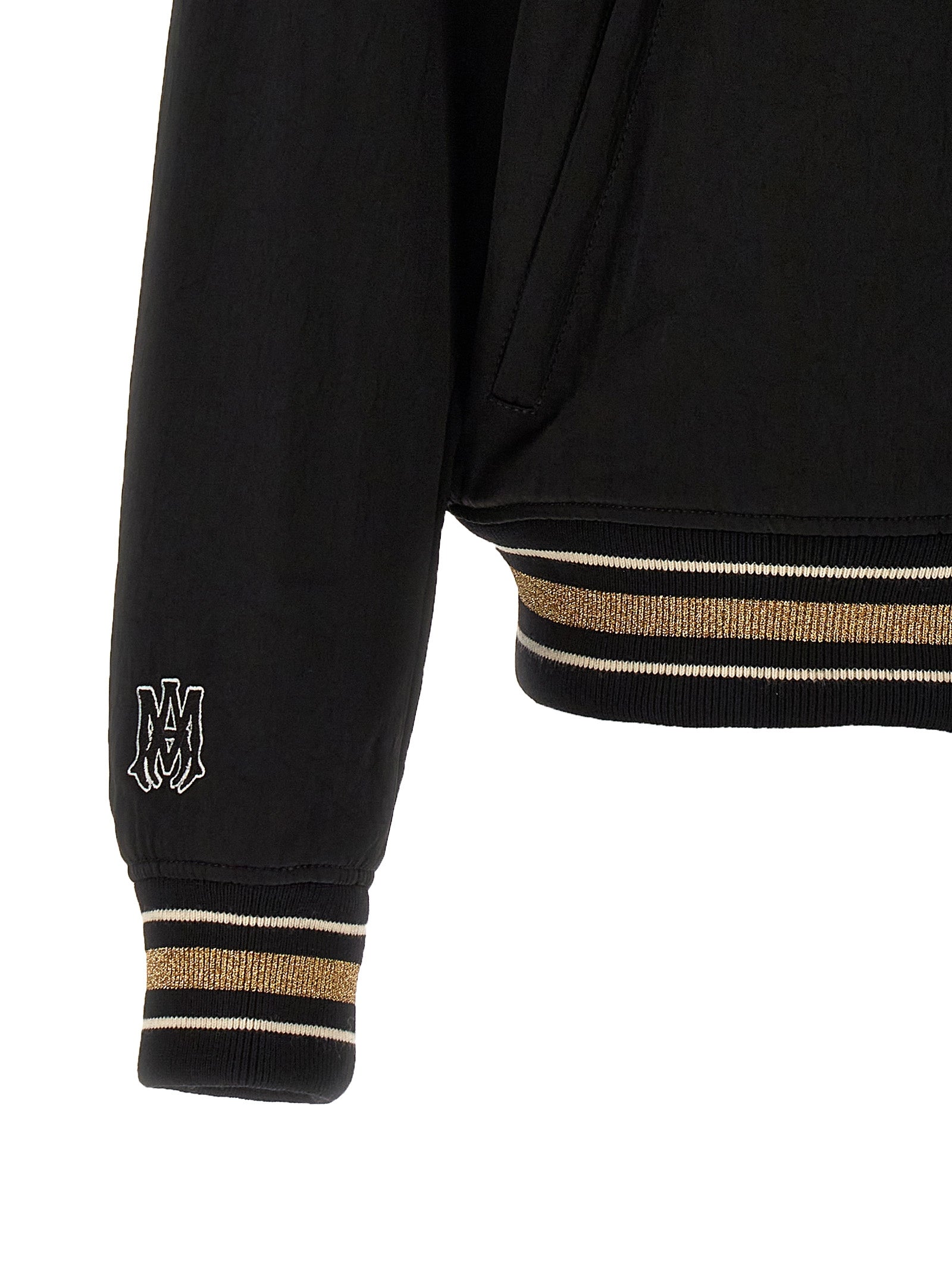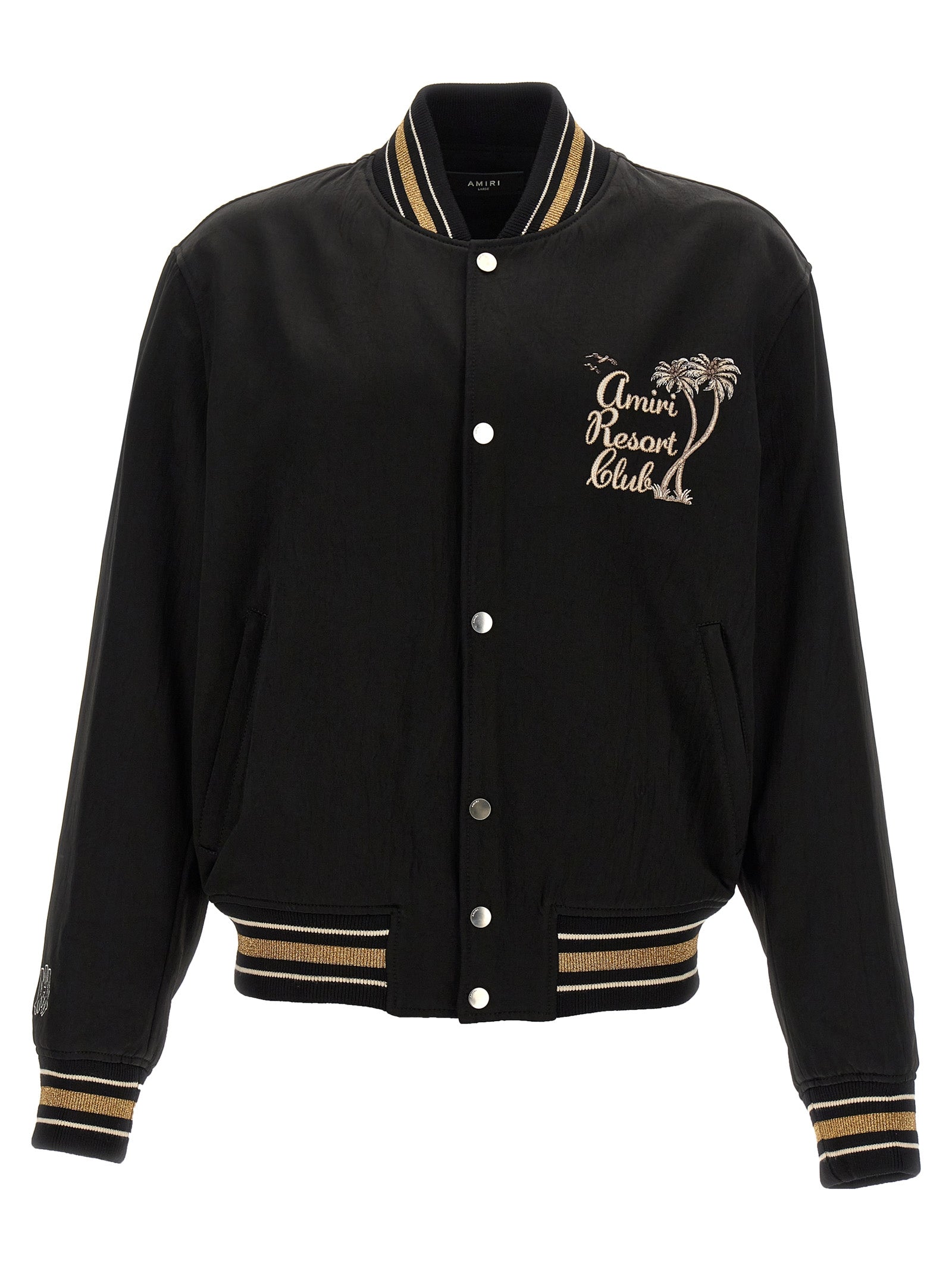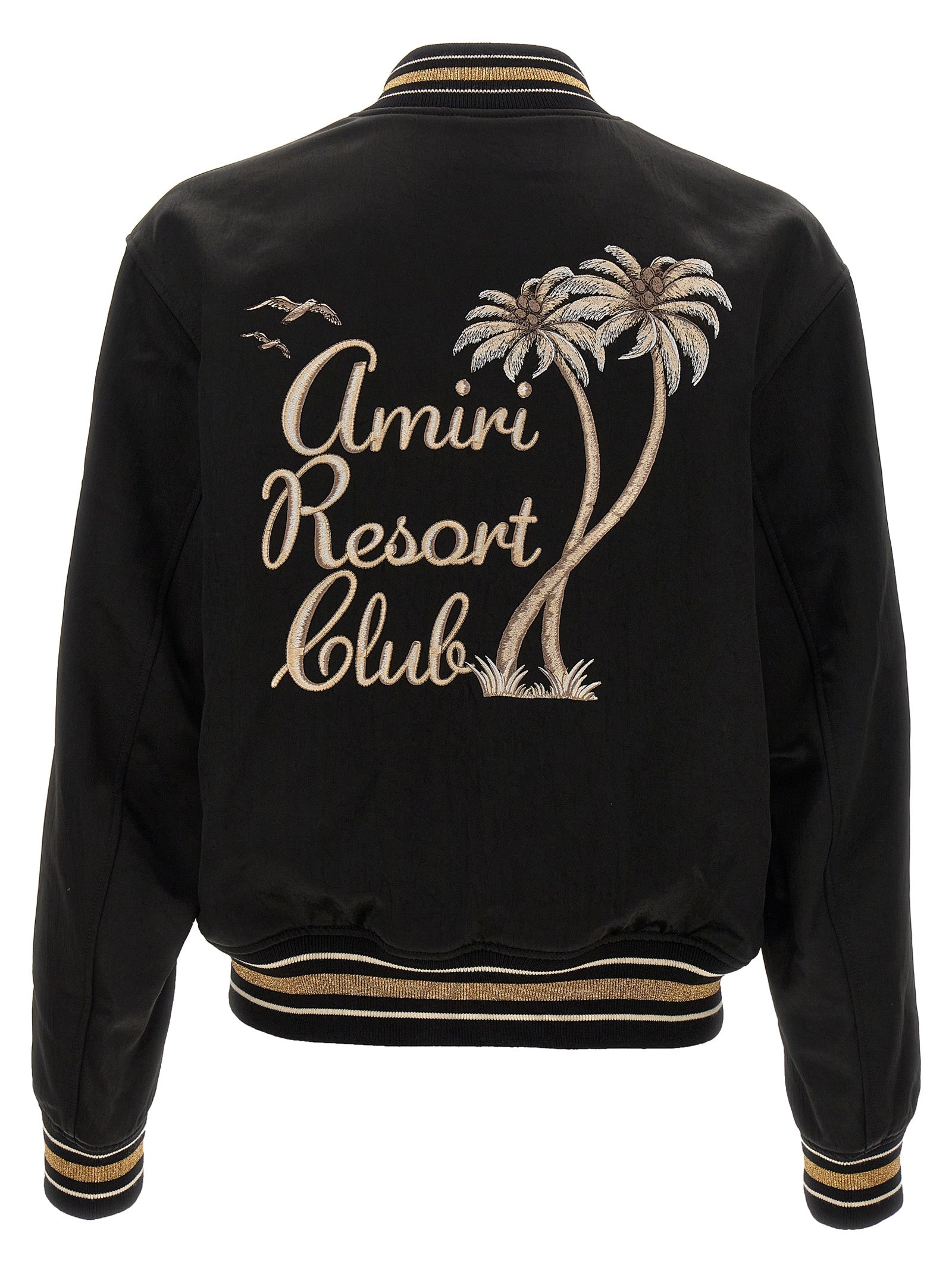 'Amiri Palms Souvenir' satin bomber jacket with embroidery on the front and back, button closure, pockets, long sleeves with knitted cuffs.