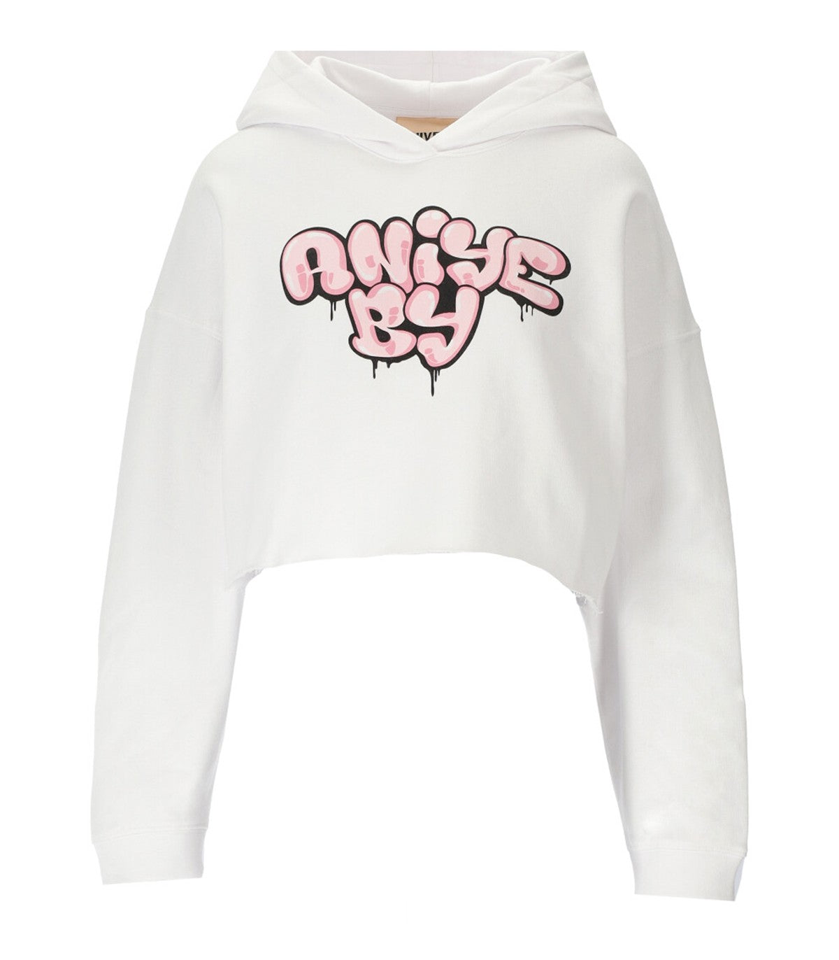 Edna hoodie by Aniye By made of white cotton, decorated with a mural-style front logo. Ribbed cuffs and raw cut hem. Composition: 100% cotton.