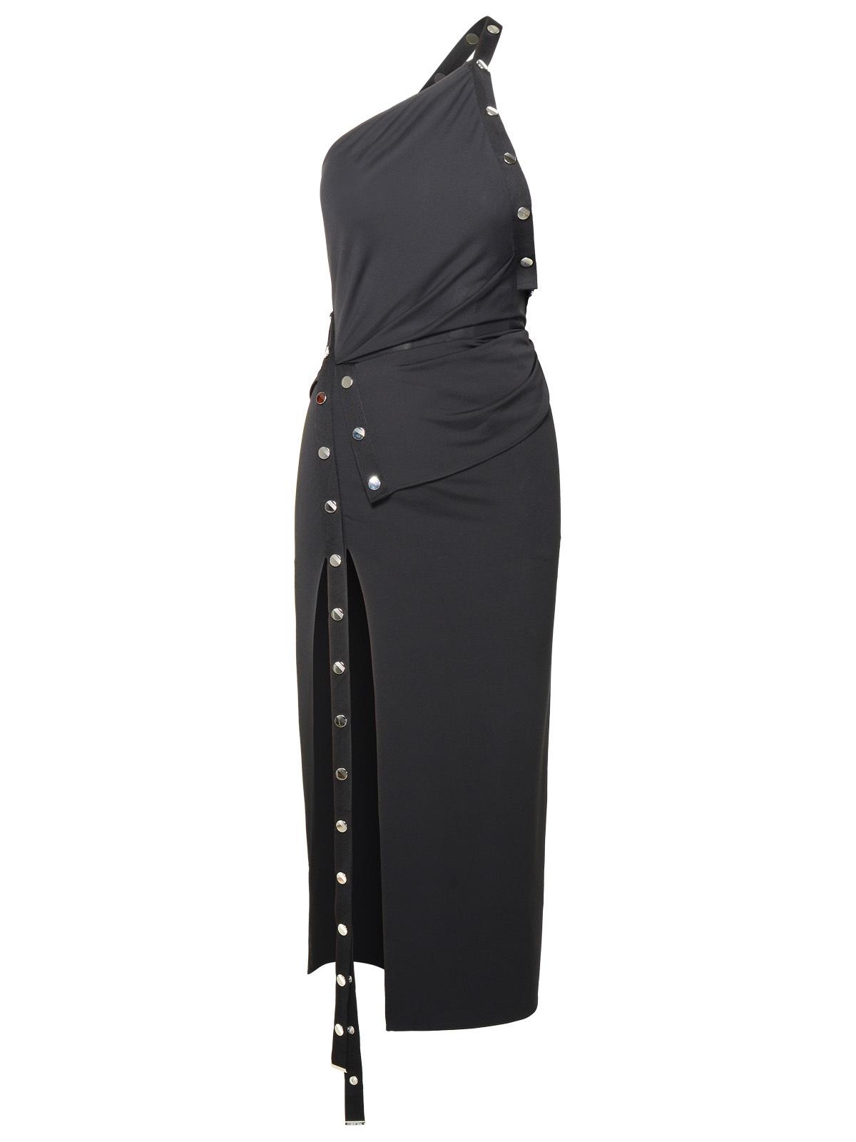 One-shoulder dress, grosgrain ribbon finished with silver logo buttons, front split