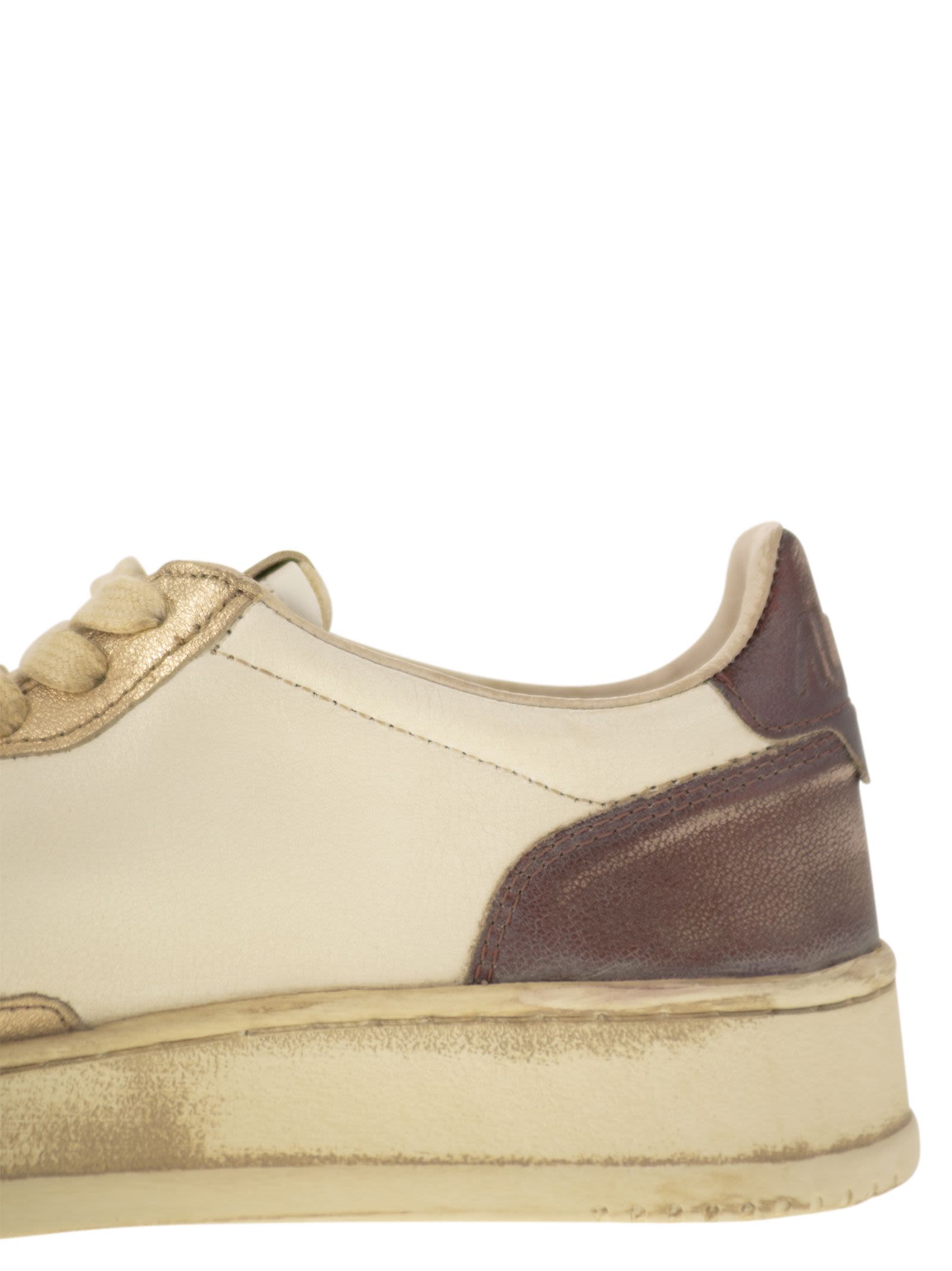 Exclusive Autry Medalist leather with worn effect, handmade by master craftsmen using innovative treatments. Autry Super Vintage is the result of a combination of elements and customisations that make the product unique and exclusive, thanks to workmanship designed and executed in Italy. Influenced by the iconic trainers of the 1980s, the Medalist leather trainers have a worn effect handcrafted by master artisans through various innovative treatments. - Leather upper with worn effect - Perforated toe for breathability - Cotton flat laces with partial waxing that gives an aged effect - Leather tongue with foam padding and Super Vintage label stitched in tone - Padded collar with contrasting inner part - Iconic contrast colour heel on the back with embossed logo - Leather and cotton terry lining - Logo-embossed leather insole, raised by 2 cm - Used-effect logoed rubber sole DESIGNER ID: AVLWMT04