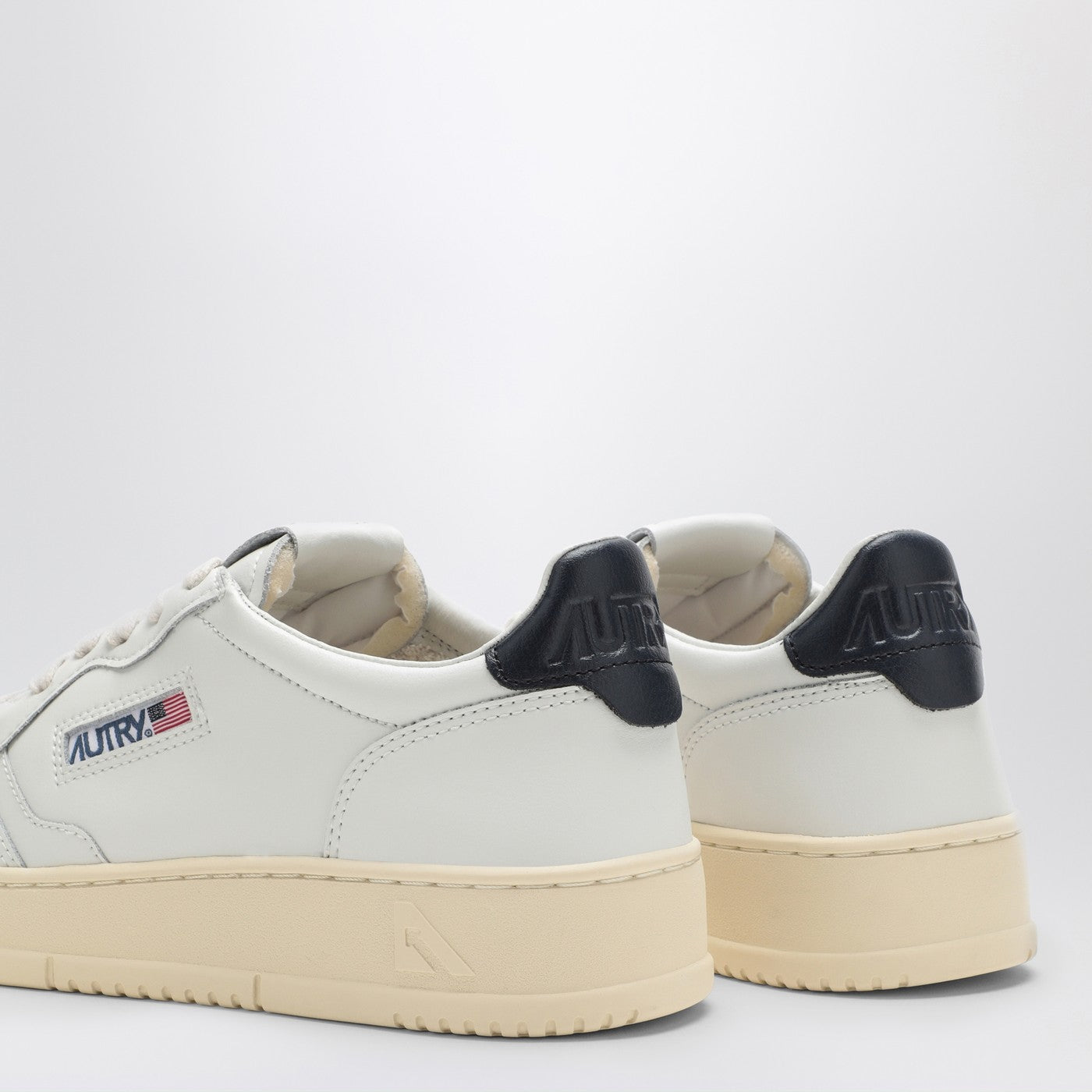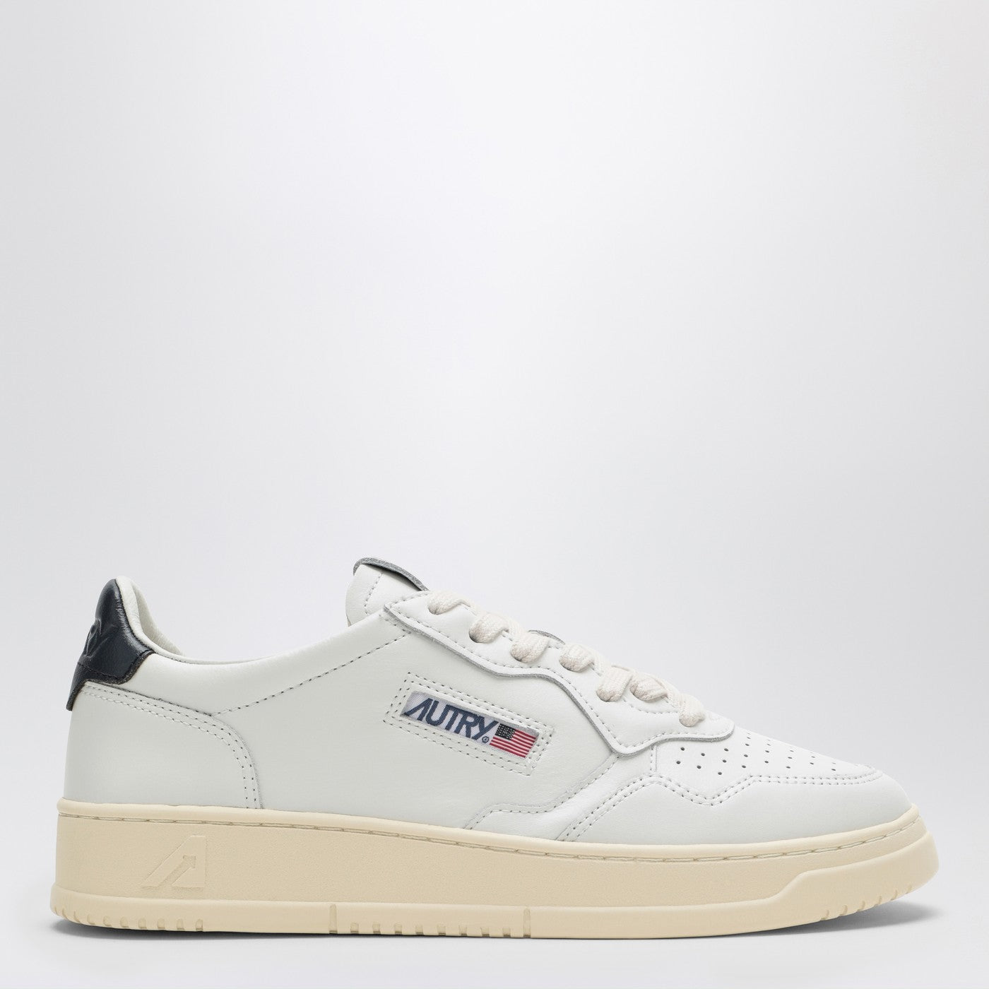 White leather low top trainer from Autry featuring logo detail on the sides, perforated toe, lace-up front fastening, leather tongue with tone-in-tone stitched label, padded collar, logoed heel on back, leather and cotton terry lining and cream-coloured rubber sole.