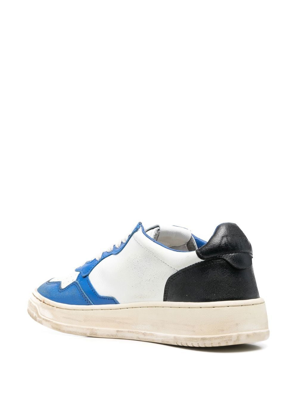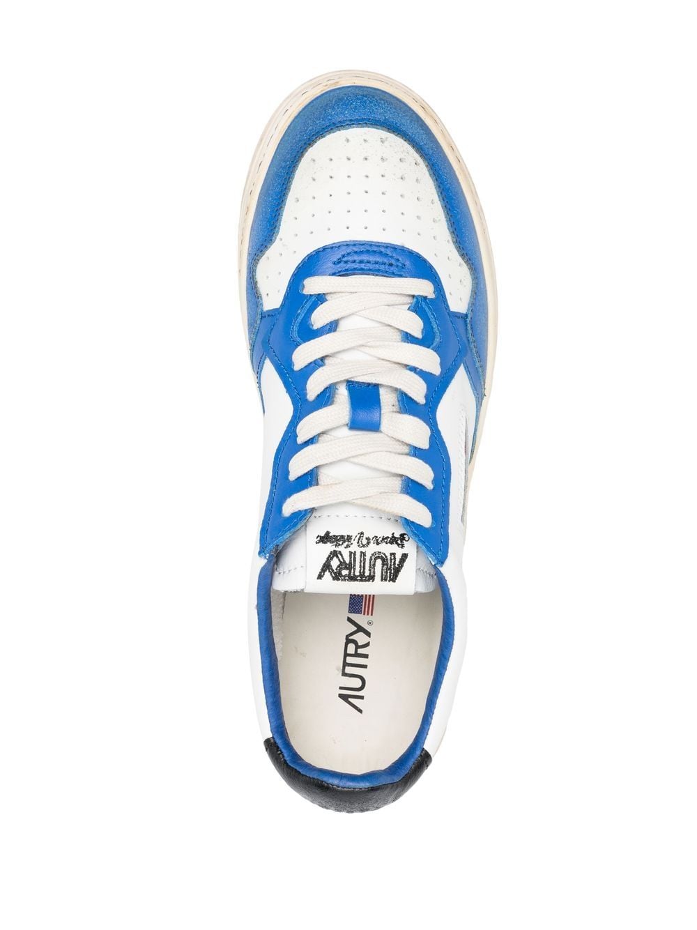 Low-top sneakers from Autry featuring panelled design, logo patch to the side, logo patch at the tongue, perforated toebox, round toe, front lace-up fastening, branded insole, flat sole, white/blue/black and leather. AVLMSV10