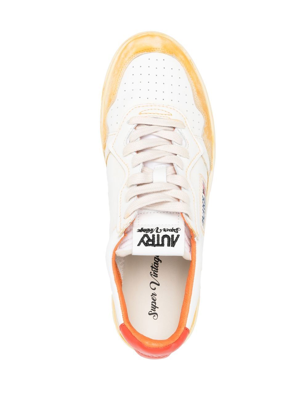 Medalist low-top sneakers from Autry featuring distressed finish, logo patch to the side, logo patch at the tongue, branded heel counter, perforated detailing, front lace-up fastening, round toe, flat rubber sole, branded insole, white/orange and calf leather. AVLMYL02