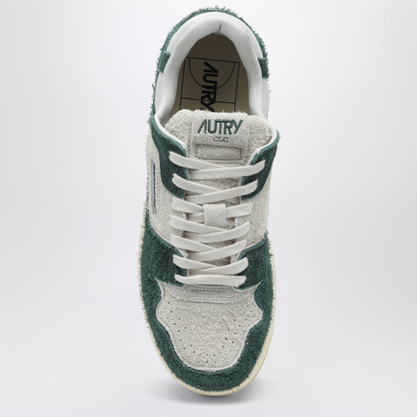 Low CLC sneaker by Autry in white and bottle green suede and mesh features a perforated round toe, a lace-up front fastening, a leather tongue with tone-in-tone stitched label and a cream-coloured rubber sole.