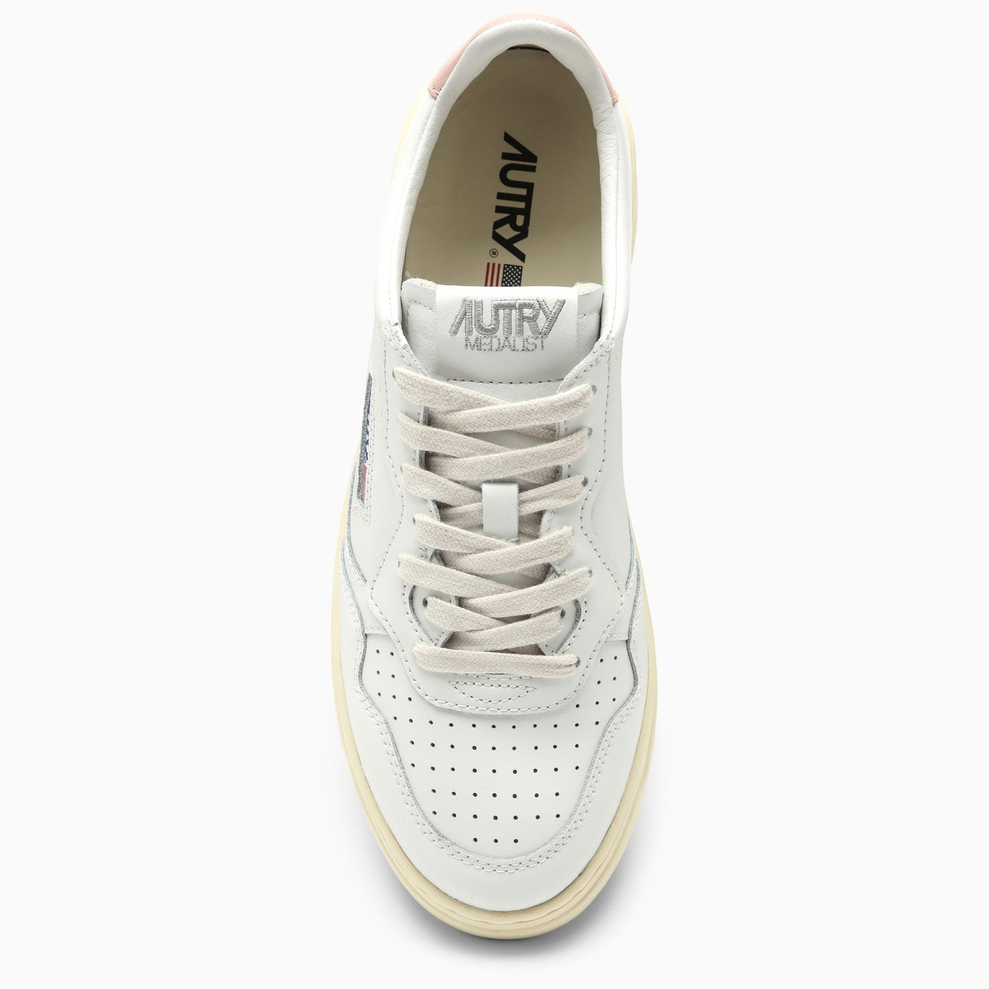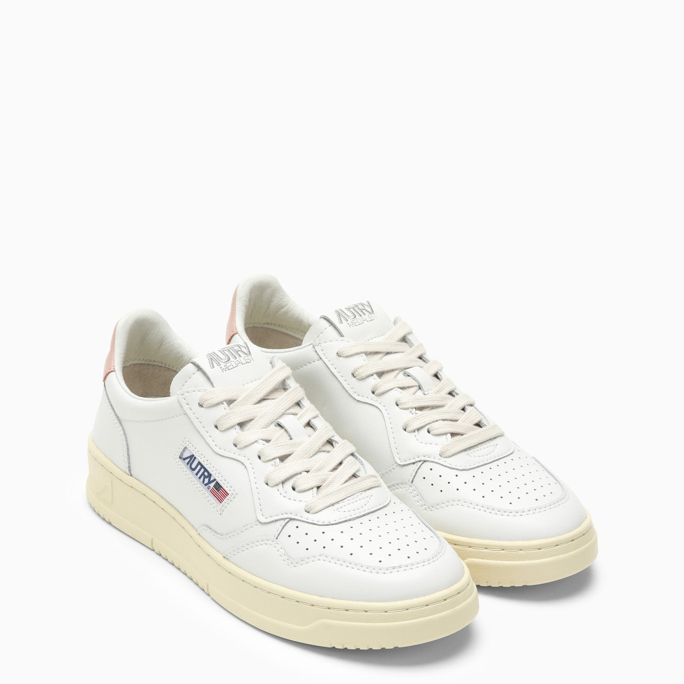 White leather low-top sneaker by Autry featuring perforated rounded toe, pink heel with embossed logo, lace closure, logo patch on the tab and on the side and rubber sole.