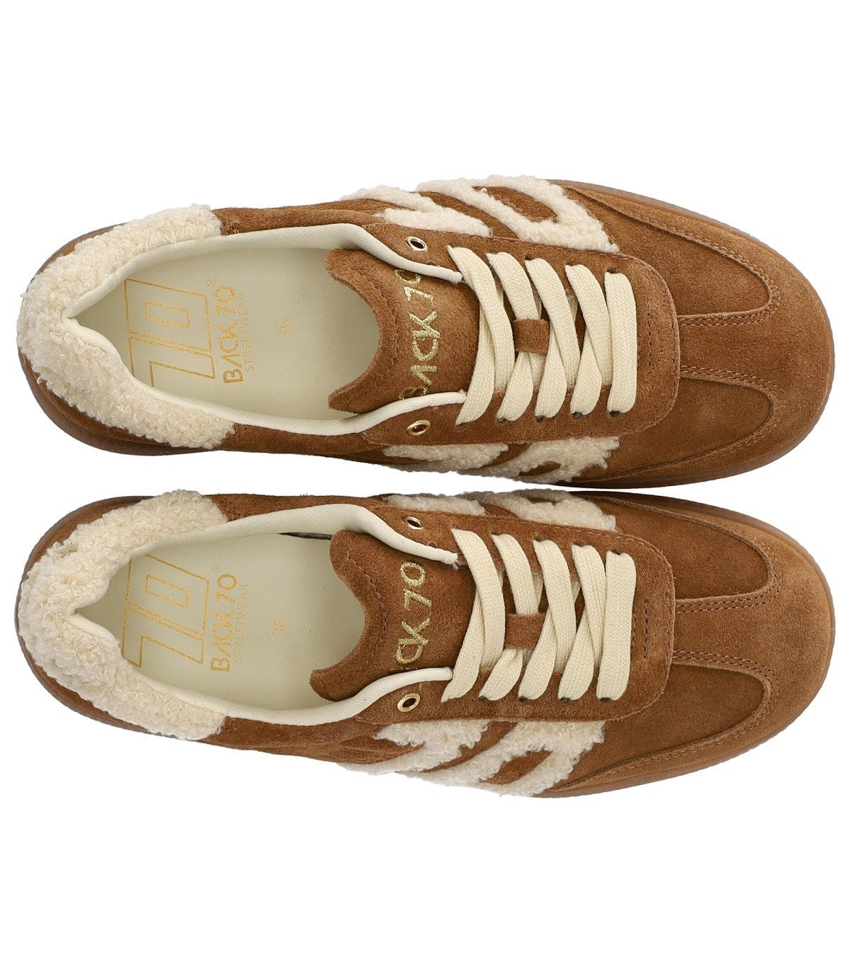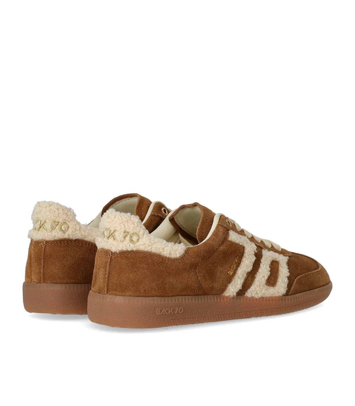 Beige Suede Sneaker by BACK70 made of suede leather in a camel hue. Characterized by an external rubber heel and side trims with white fur details. Internal cotton lining and external tongue with printed golden logo. Cotton laces. Sole size 3 cm.