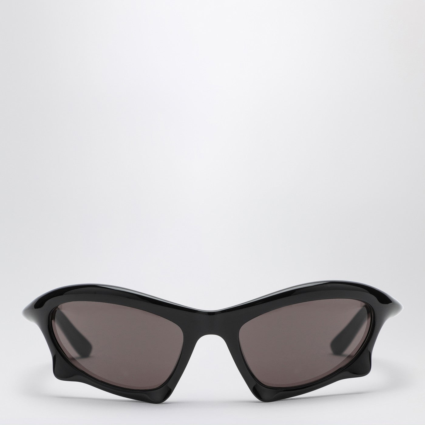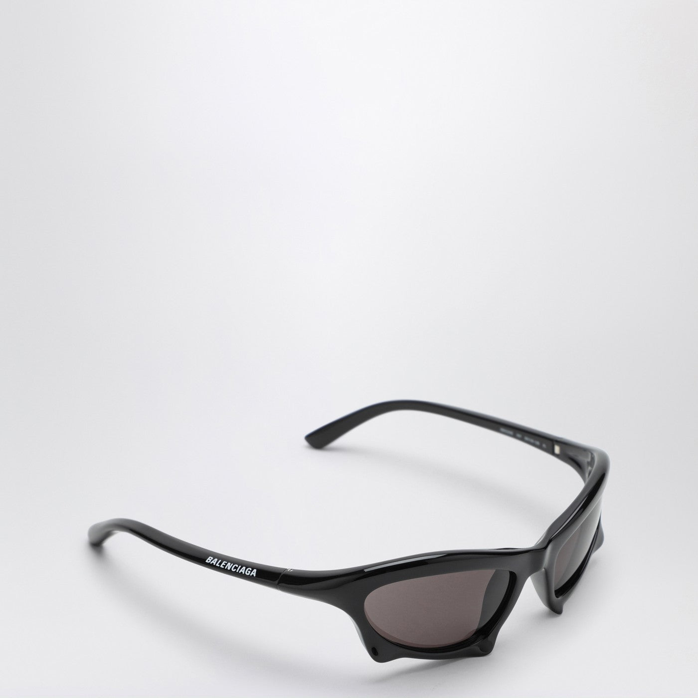 Black acetate Balenciaga sunglasses featuring a curved design, black lenses and logo on the arms.