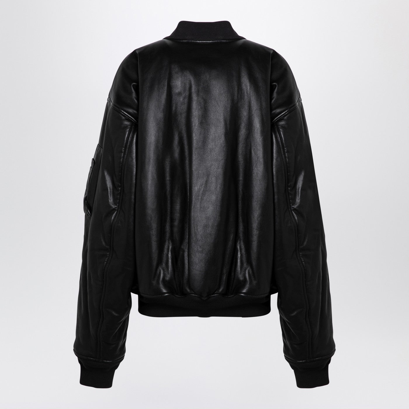 Black lambskin leather bomber jacket from Balenciaga featuring a double zip fastening with a leather tab, a long sleeve with a patch pocket, two side welt pockets, ribbed knit trims and an over fit.