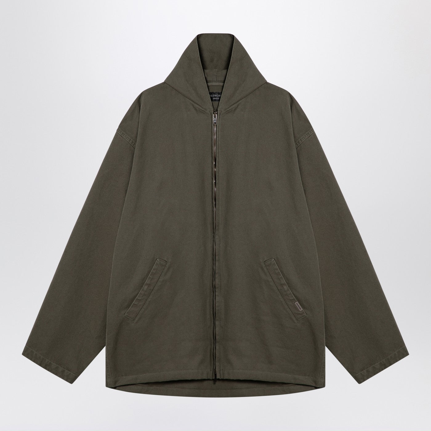 Green heavy cotton hooded jacket from Balenciaga featuring a double zip front fastening, two welt pockets on the front with a lettering logo plaque, extra long sleeves and an oversized fit.