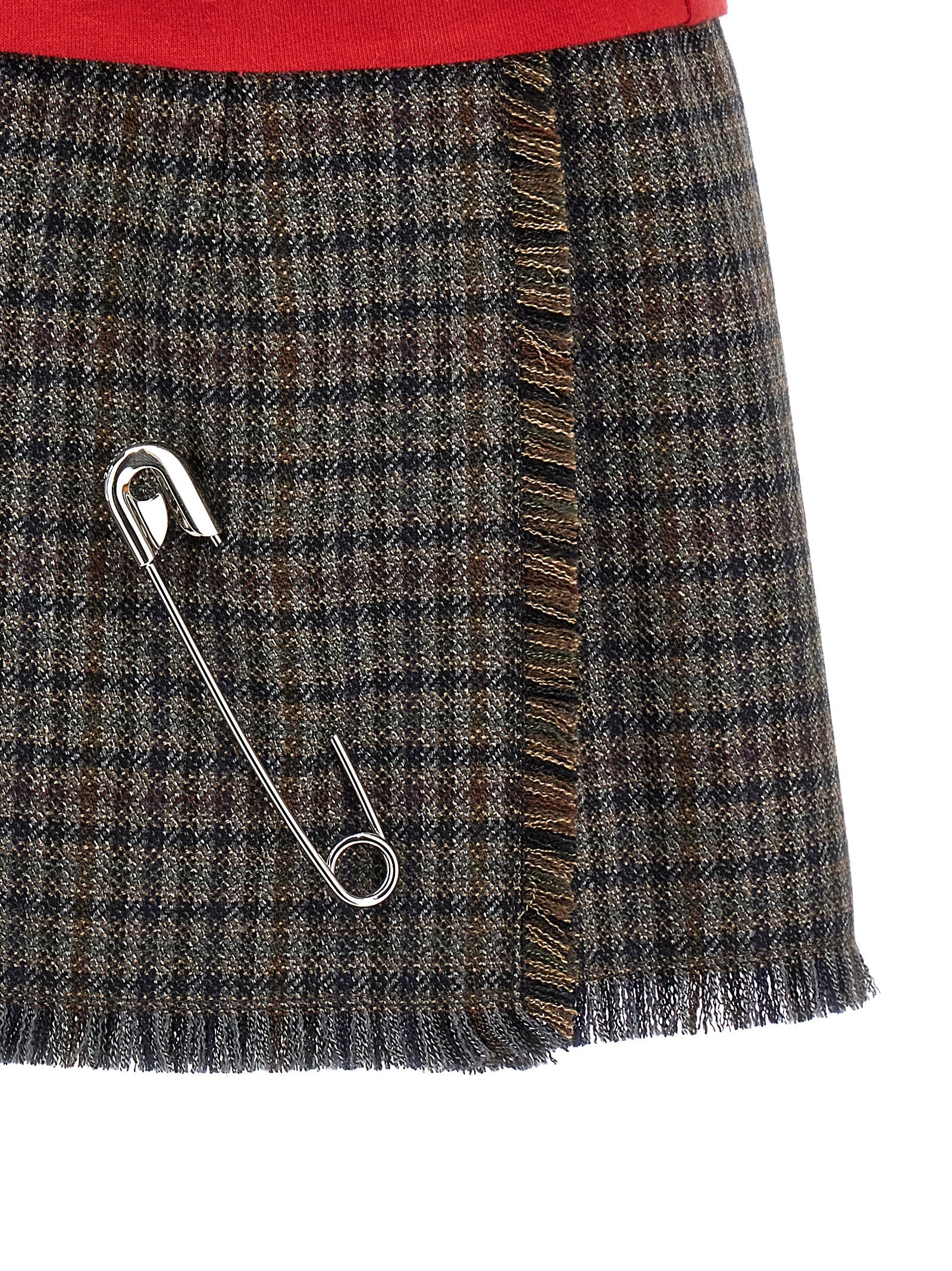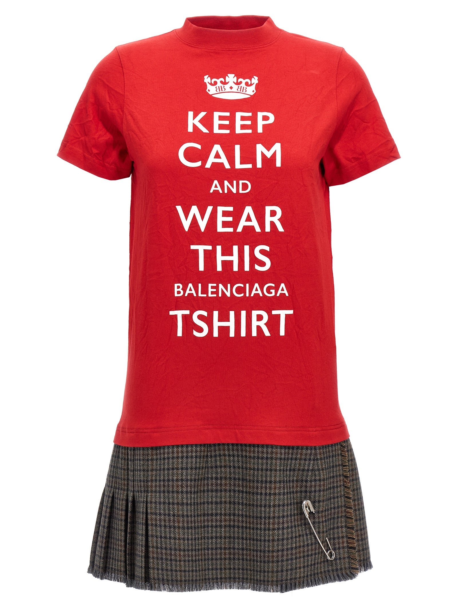 'Keep Calm' wrinkled cotton dress with front print, pleated check wool skirt with fringes at the edges and brooch application, crew neck, short sleeves.