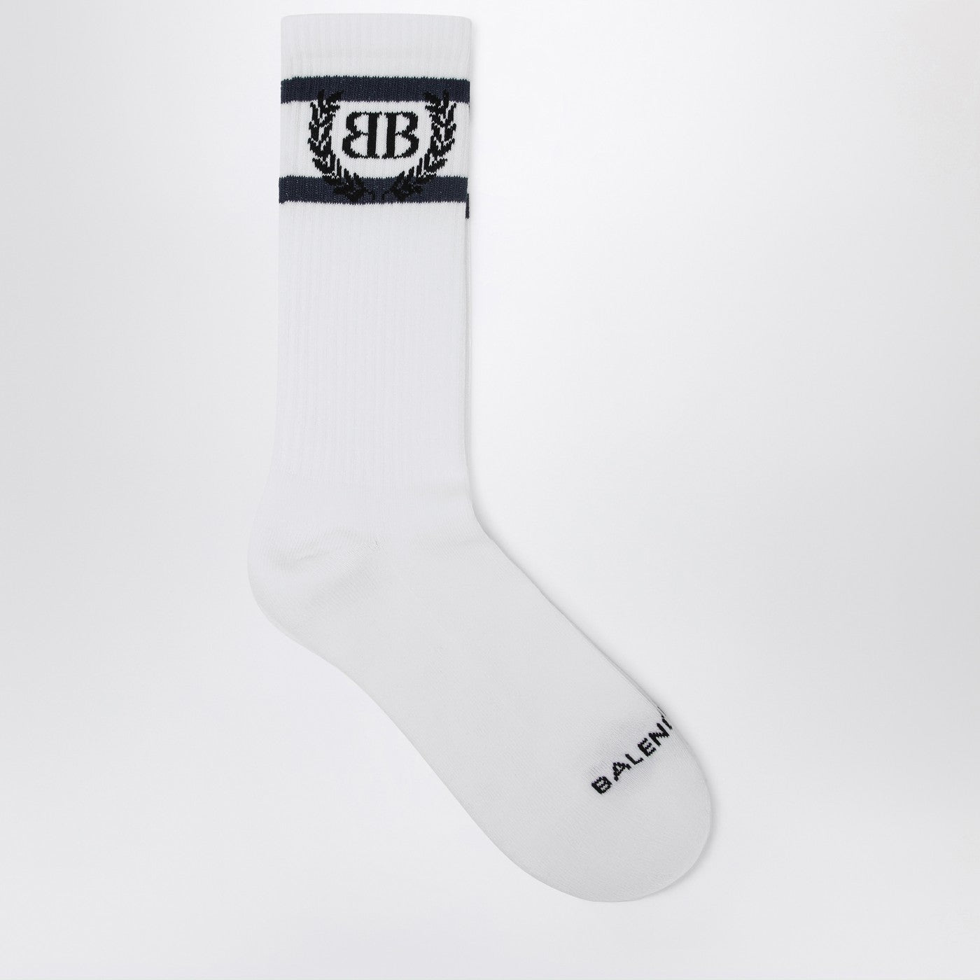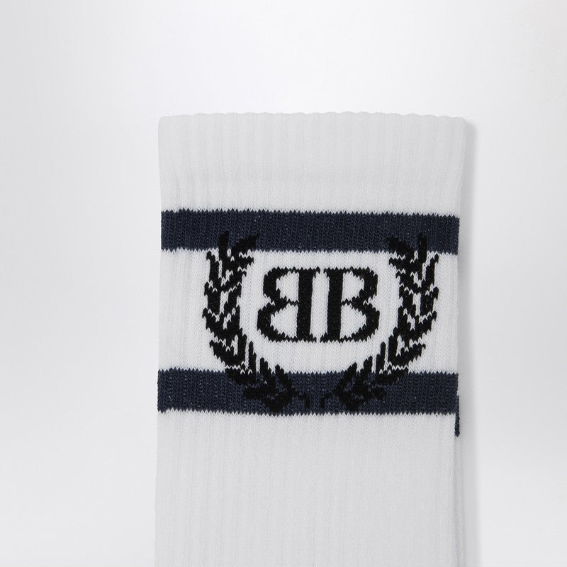 Balenciaga socks in white and blue cotton blend, featuring classic laurel embroidery on the upper ankle and logo lettering embroidery on the foot.