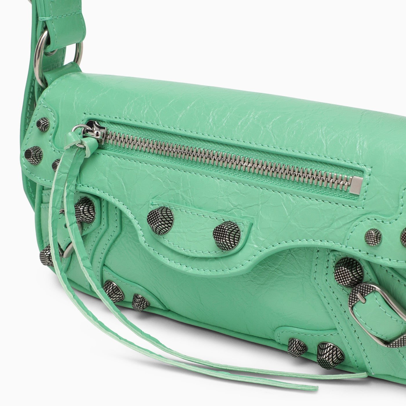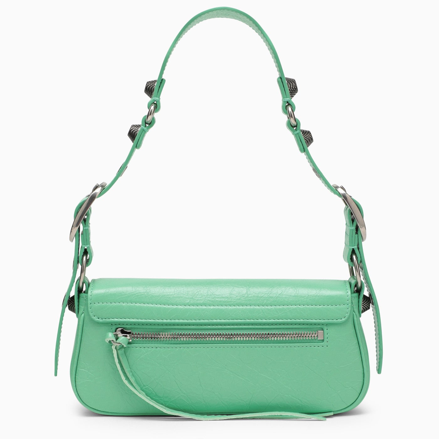 Mint green lambskin leather shoulder bag from Balenciaga featuring an adjustable shoulder strap, a studded magnetic closure, a front and a back zip pocket, antiqued silver-tone hardware and an internal patch pocket.