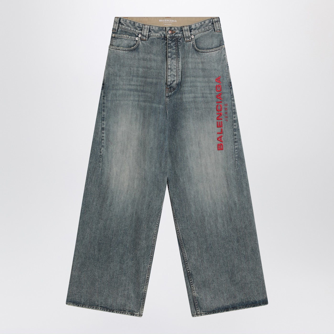 Wide jeans by Balenciaga in light blue cotton denim with a faded effect, featuring a front closure, belt loops, five classic pockets, a back logo patch, contrasting embroidered lettering logo on the front, and a baggy fit.