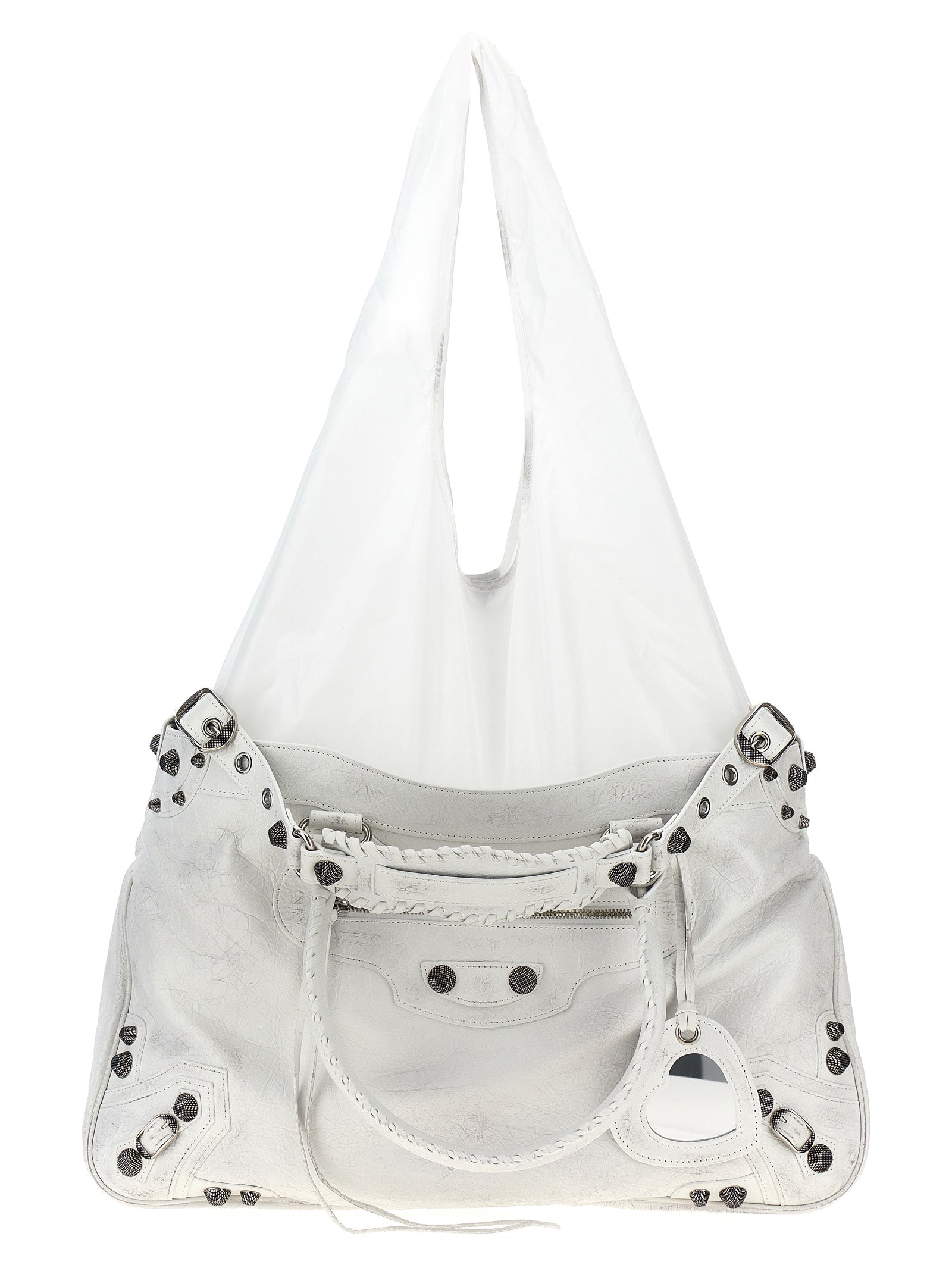 Arena lambskin leather Neo Cagole XL Plus shopping bag and used-effect nylon, double handle, adjustable and removable shoulder strap, knotted nylon handle closure, removable heart mirror.