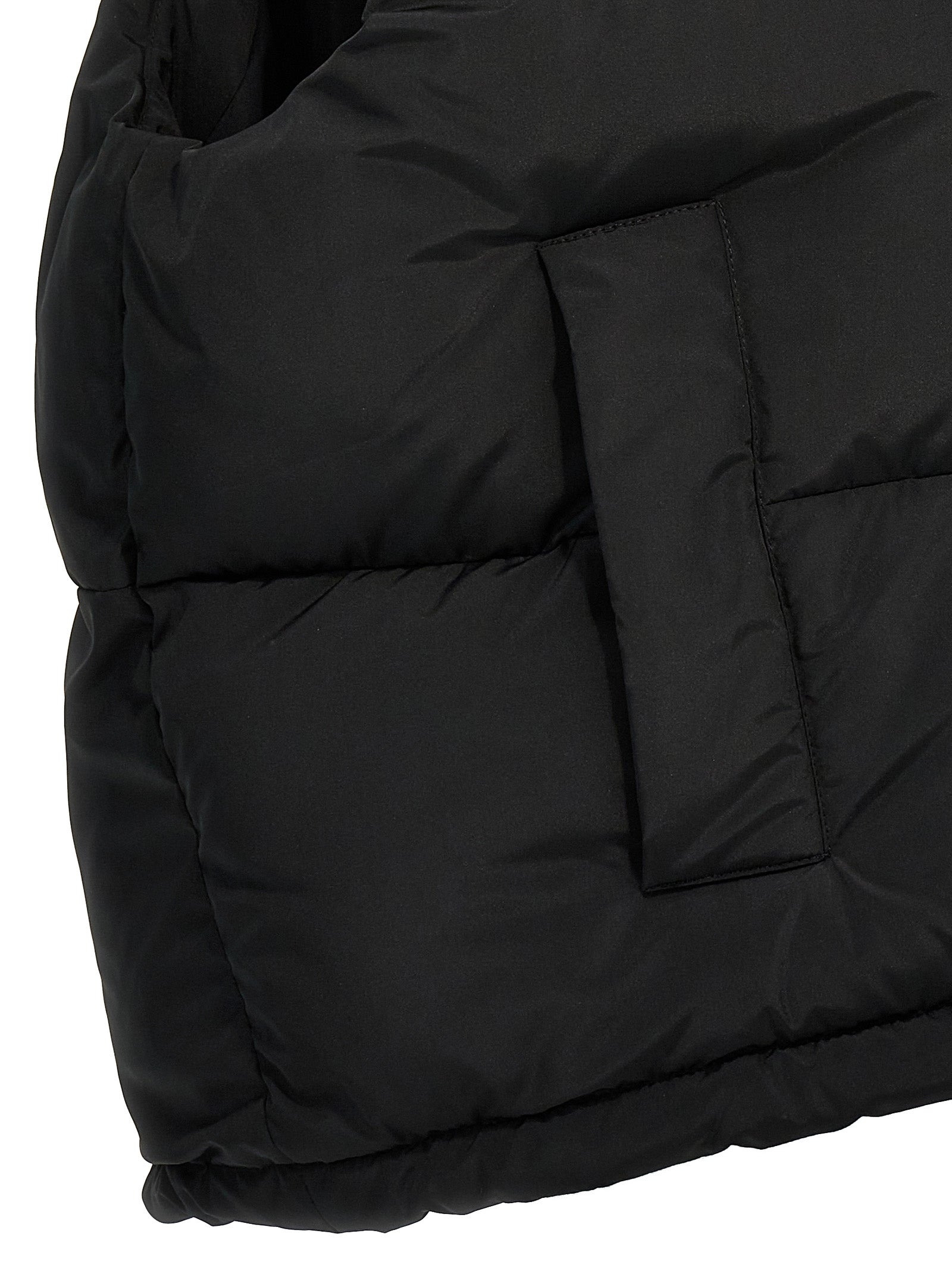 'Puffer Cocoon Political Campaign' vest in micro padded technical faille, zip and button closure, pockets, removable hood, logo embroidery on the front and back.