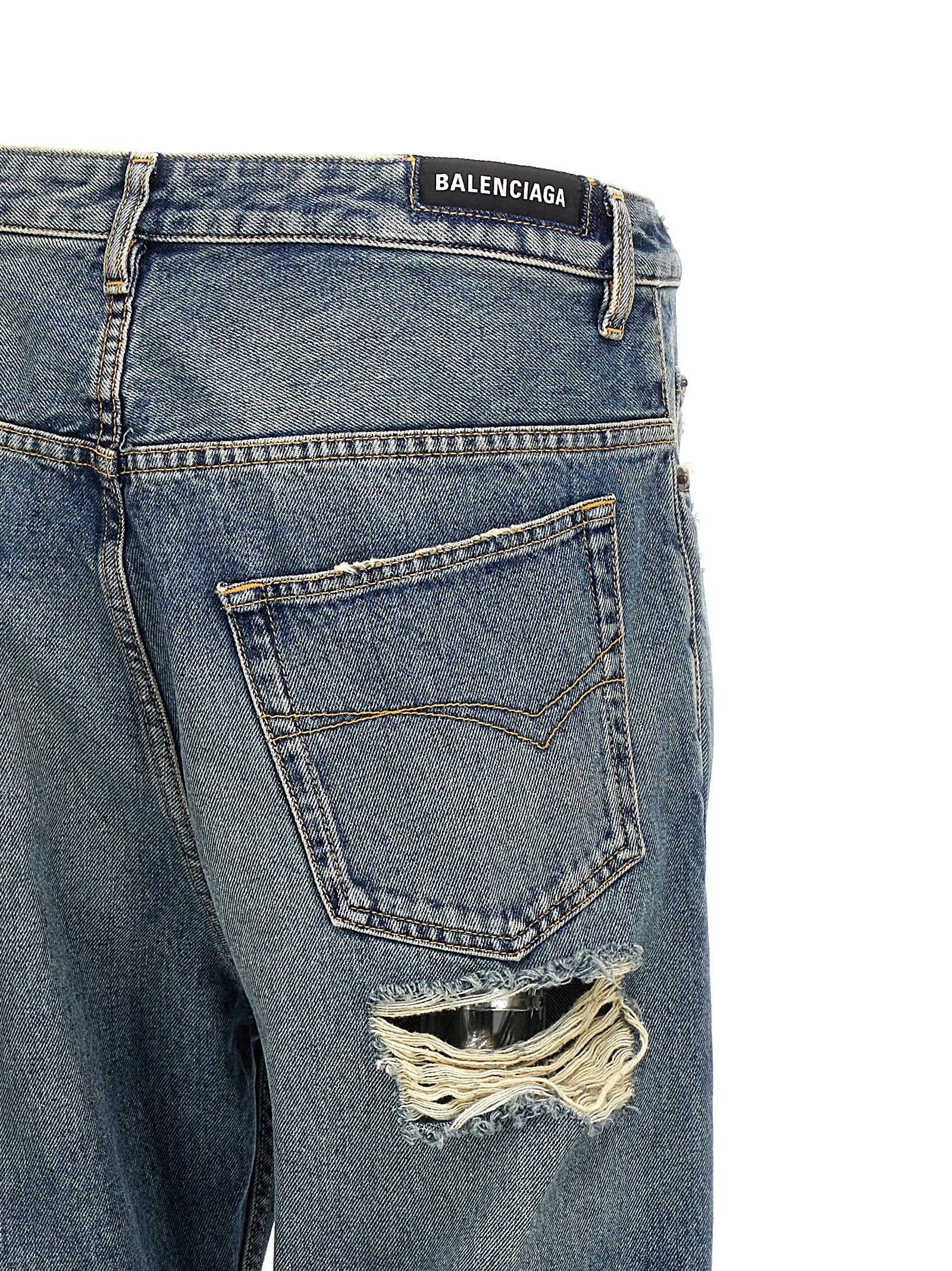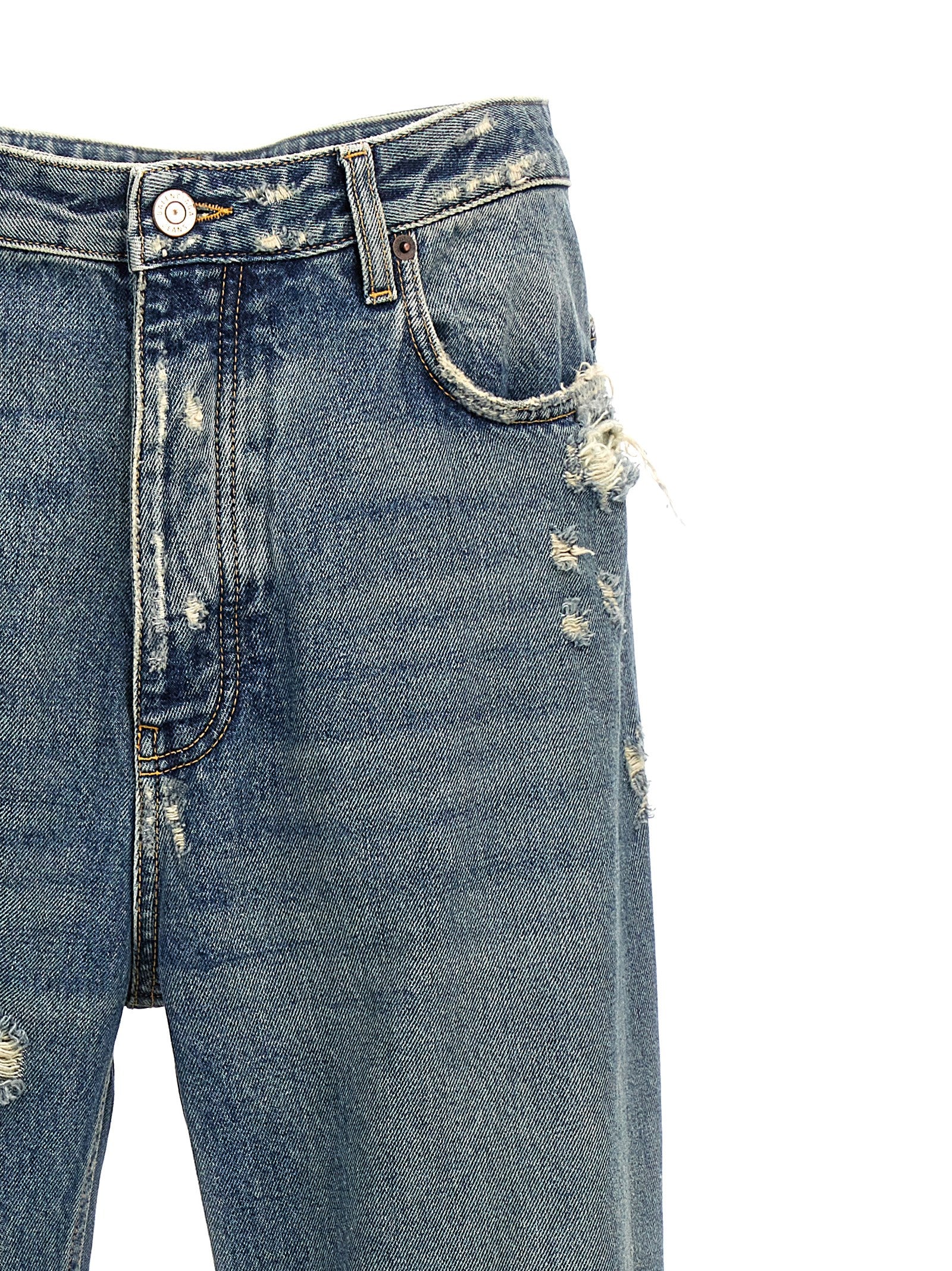 'Ripped' cotton denim jeans with used and destroyed effect details, button closure, five pockets, back logo label.