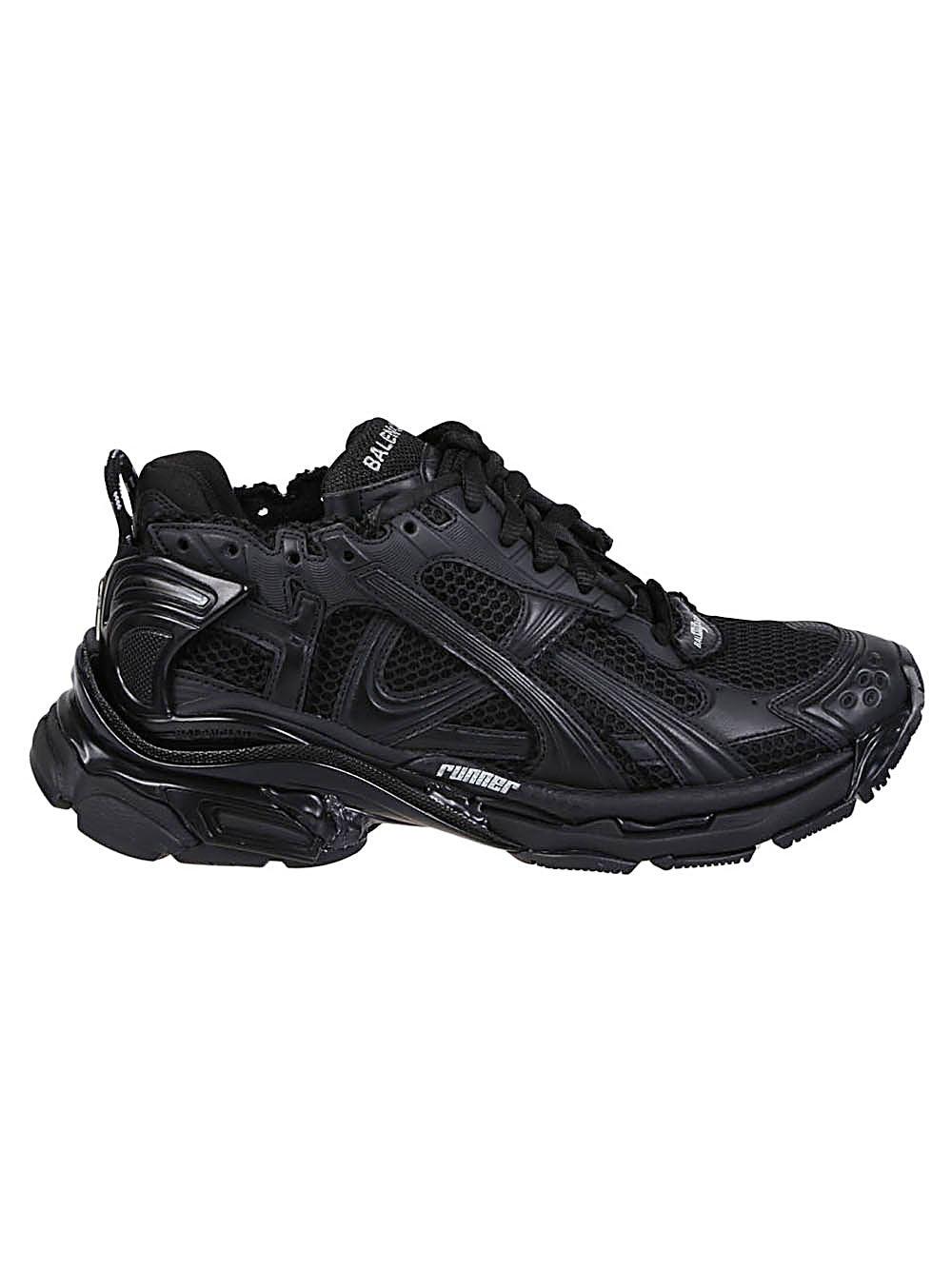Black sneaker, with a consumed effect, imprinted size posteriorly, cut printed on the edge on the tip, externally printed runner logo, Balenciaga logo on the tongue and on the back.