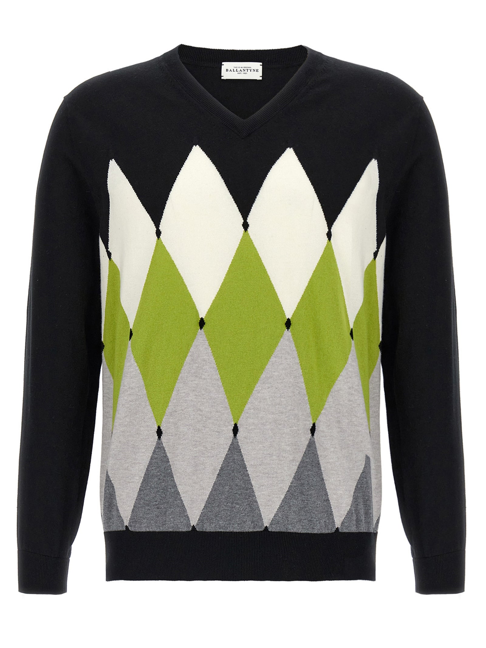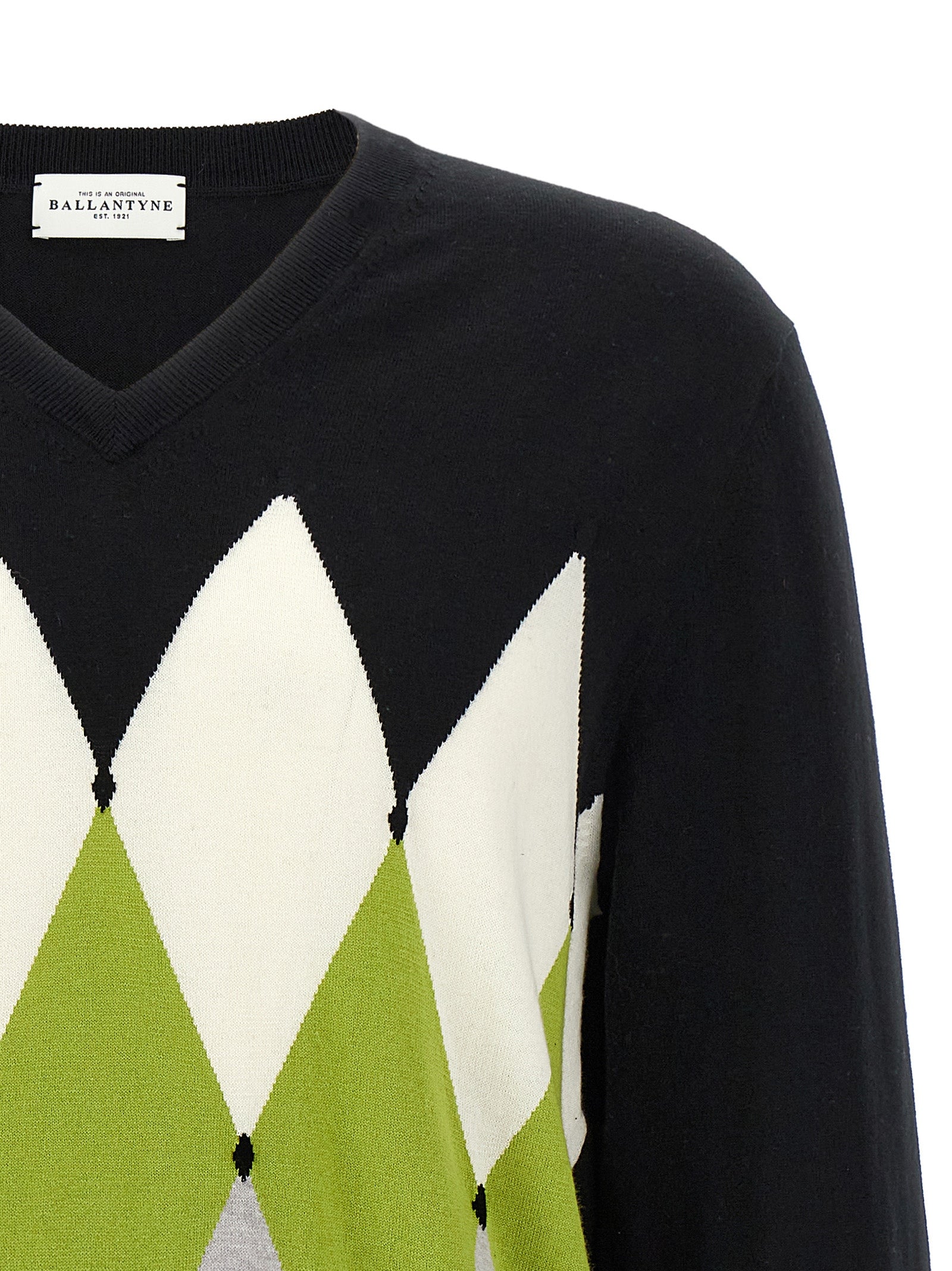 Cotton and cashmere blend sweater with 'Argyle' pattern, V-neck, long cuffed sleeves.