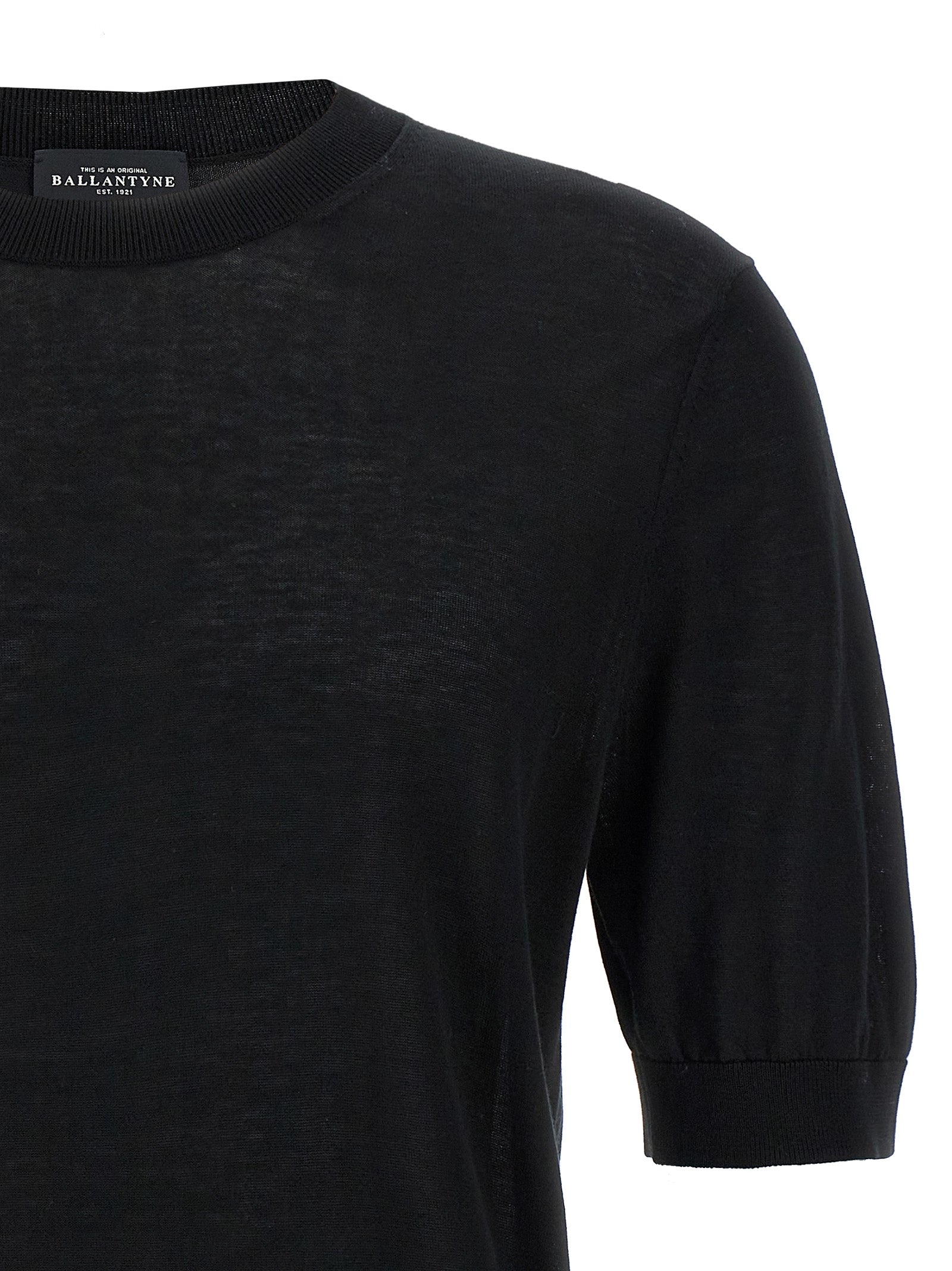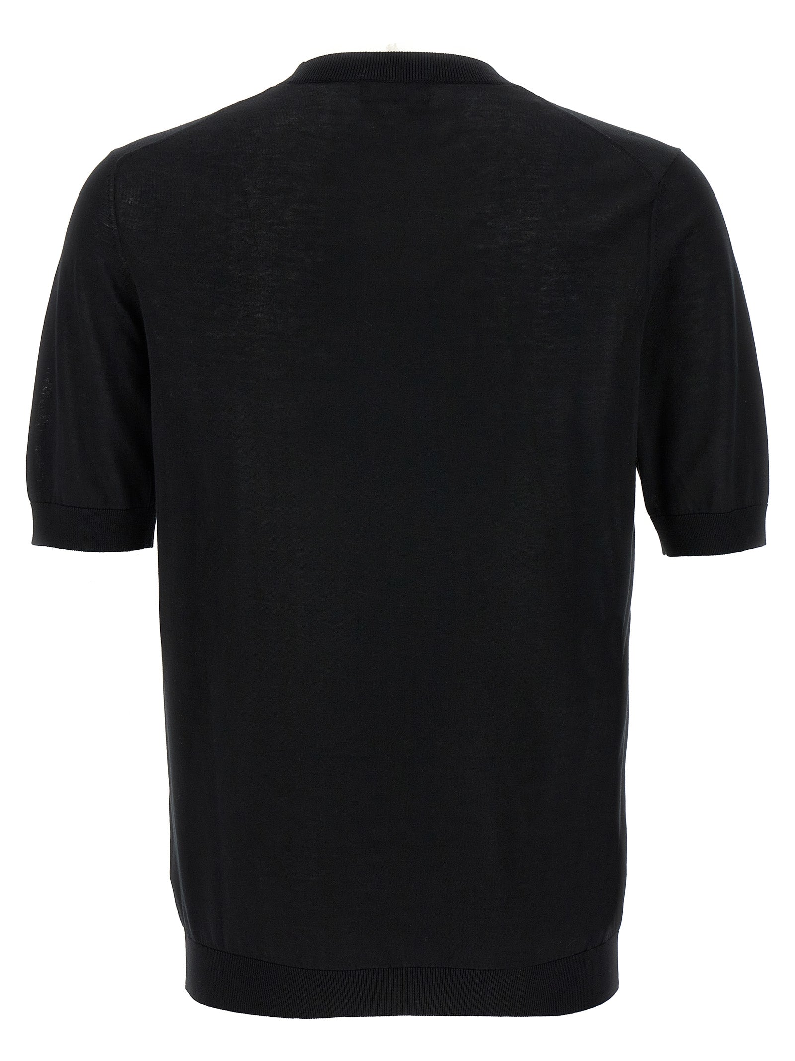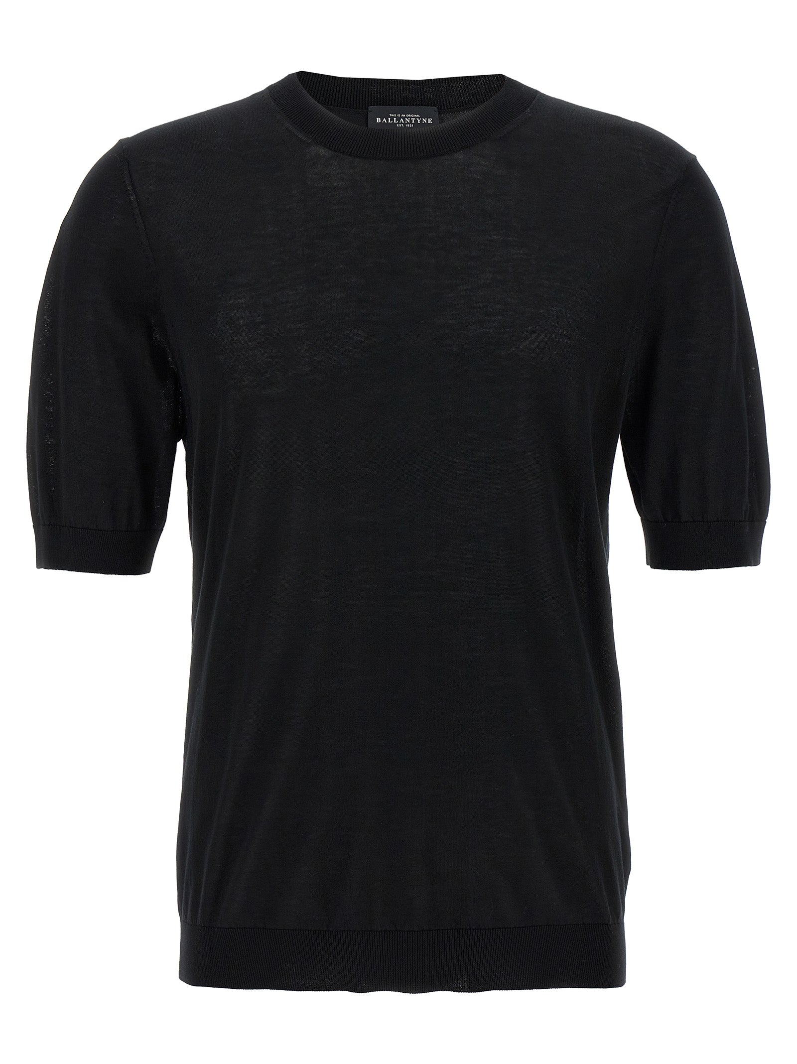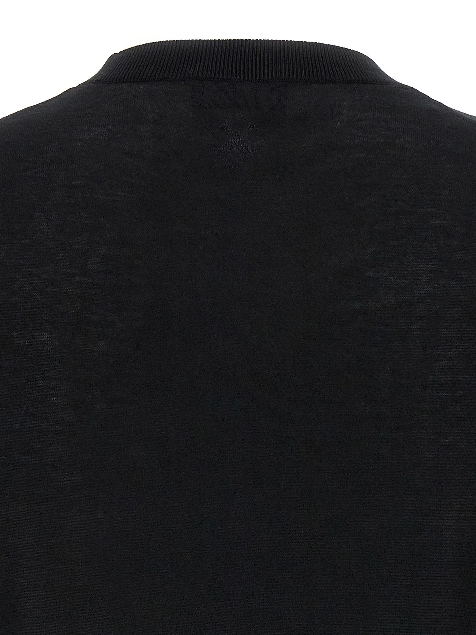 'R Neck' lightweight cotton sweater with crew neck and short cuffed sleeves.