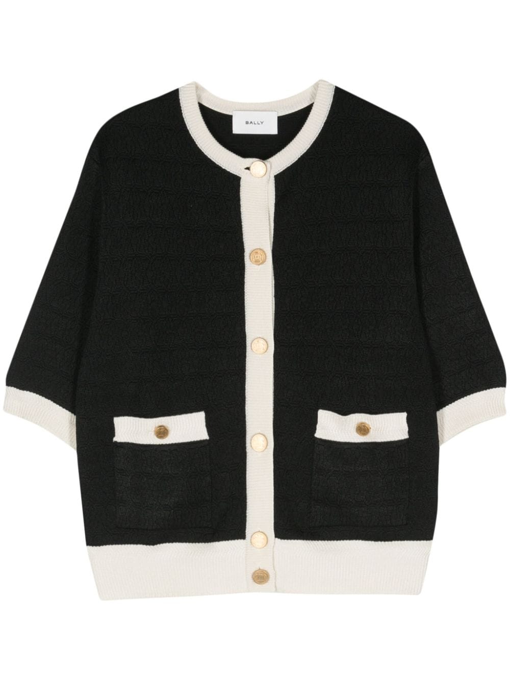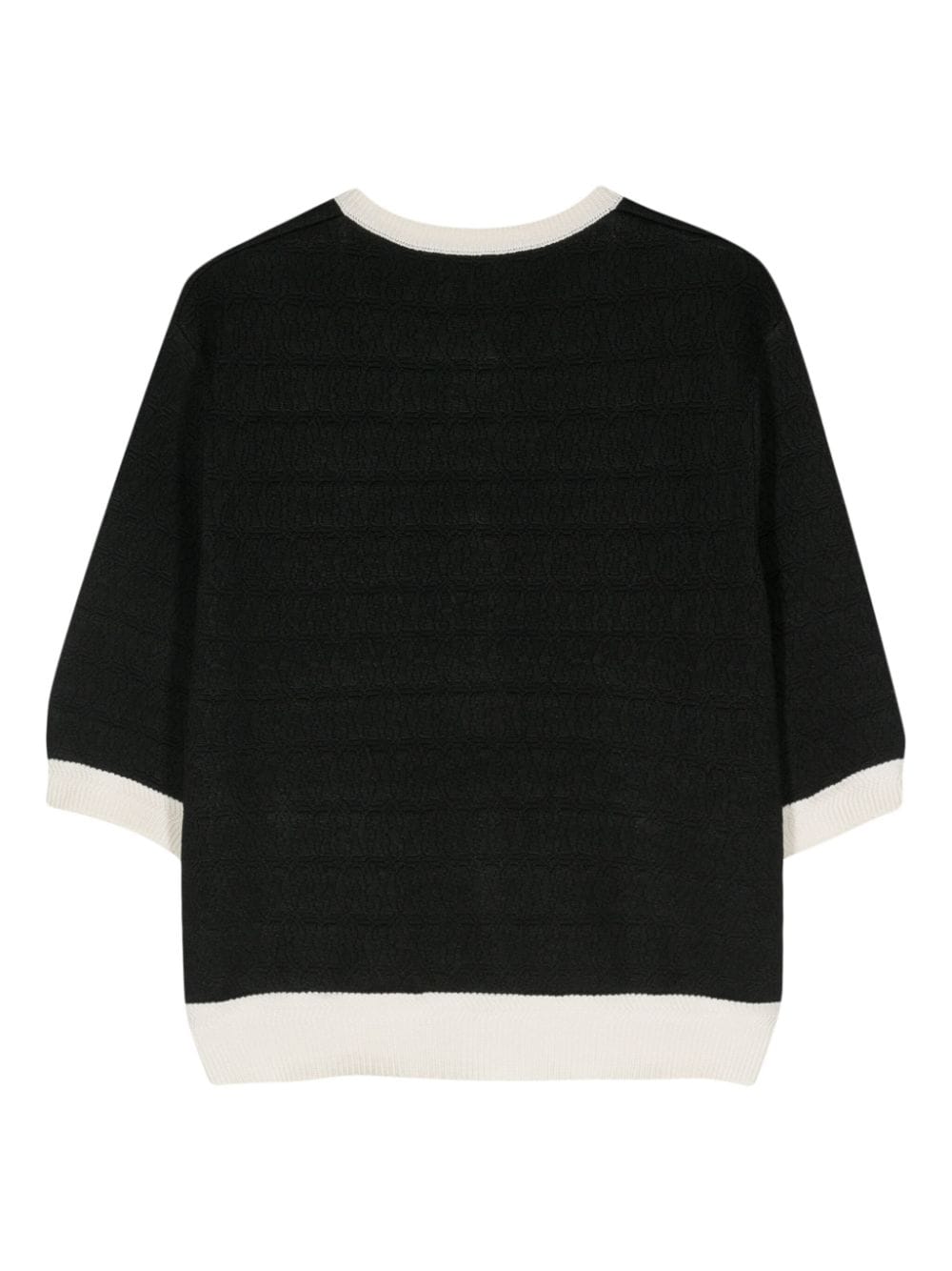 black/ivory white knitted construction contrasting ribbed trim jacquard logo motif round neck half-length sleeves unlined straight hem front button fastening logo-engraved buttons