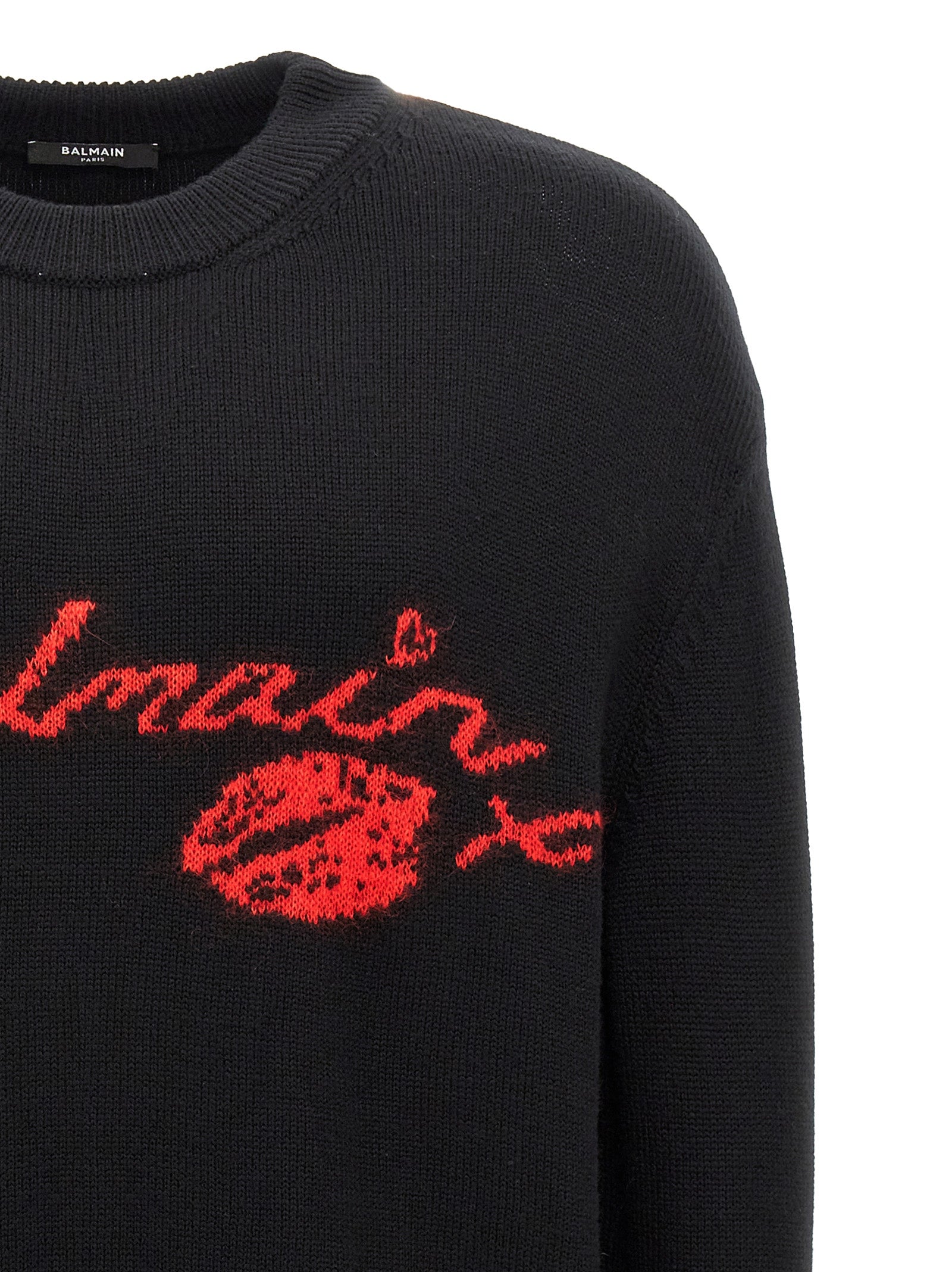 'Balmain Kiss' wool sweater with front intarsia, crew neck, long cuffed sleeves.
