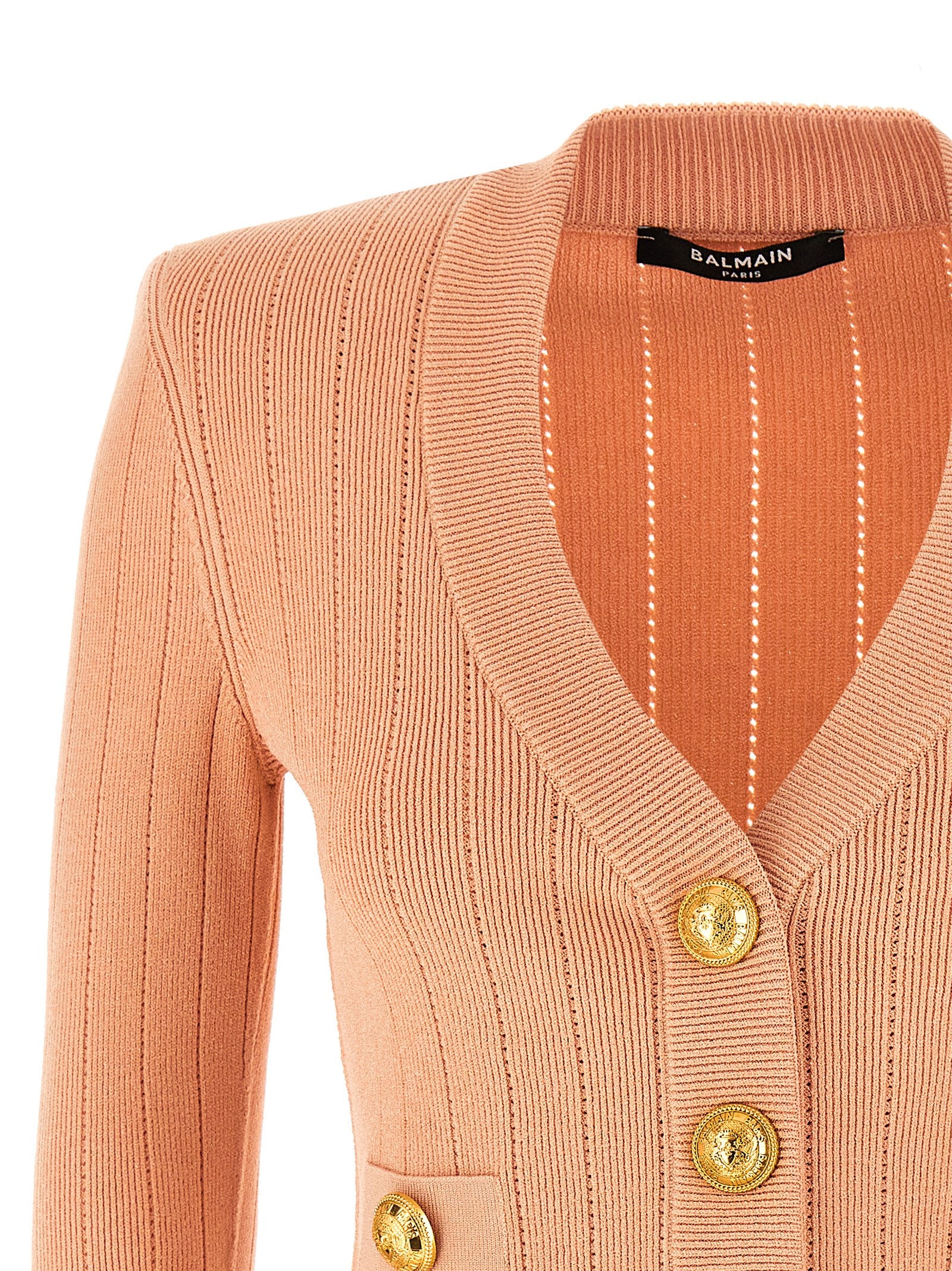 Knitted cardigan in viscose blend, gold metal 'Chiocciola' button closure, crop style with padded shoulders, long sleeves.