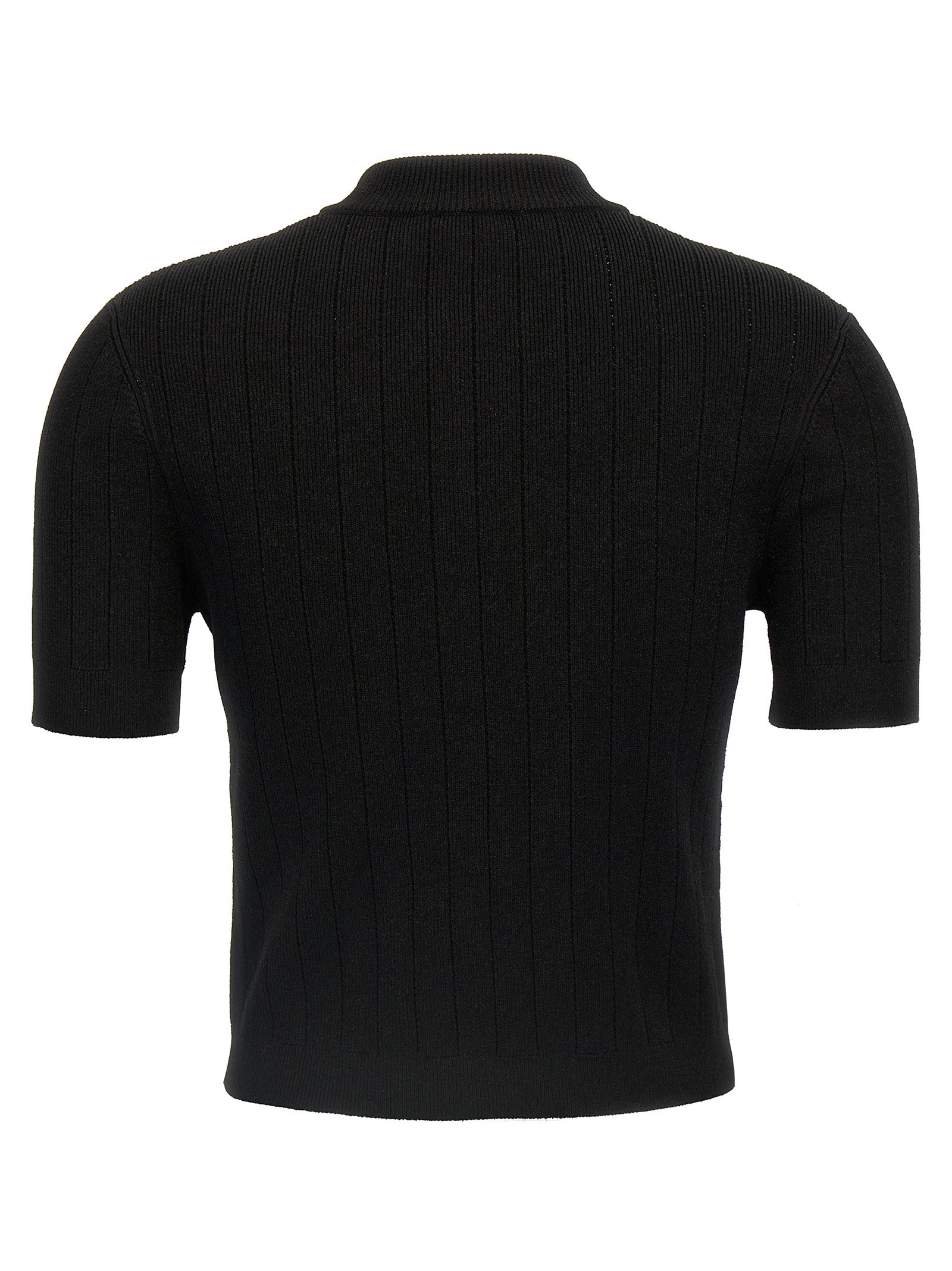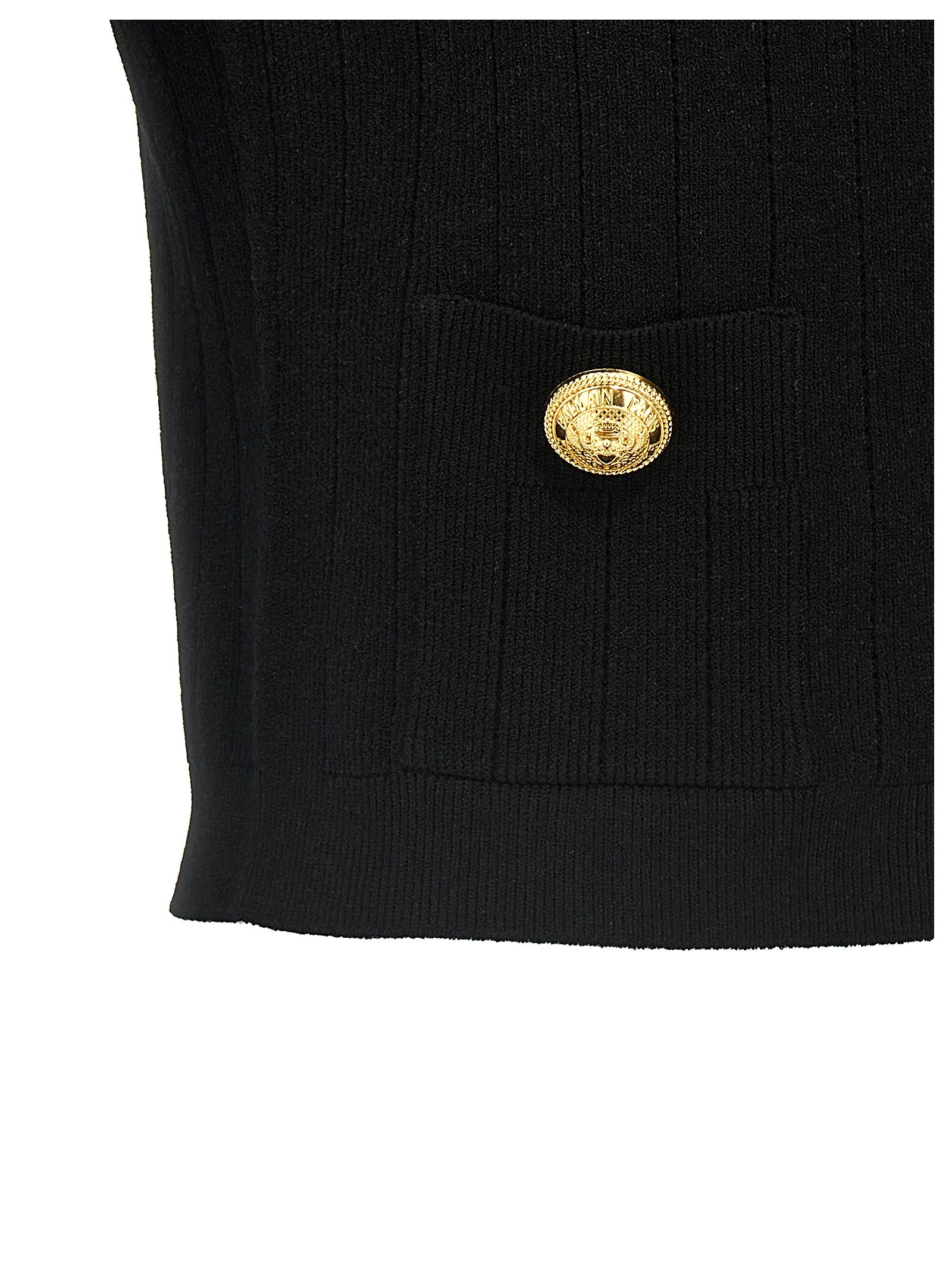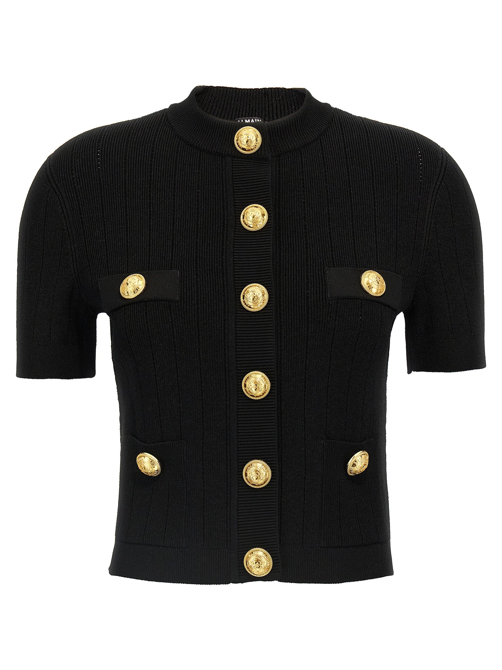 Cardigan in stretch viscose blend with 'Chiocciola' logo buttons, trompe-l'œil pockets, snap button closure, crew neck, short sleeves.