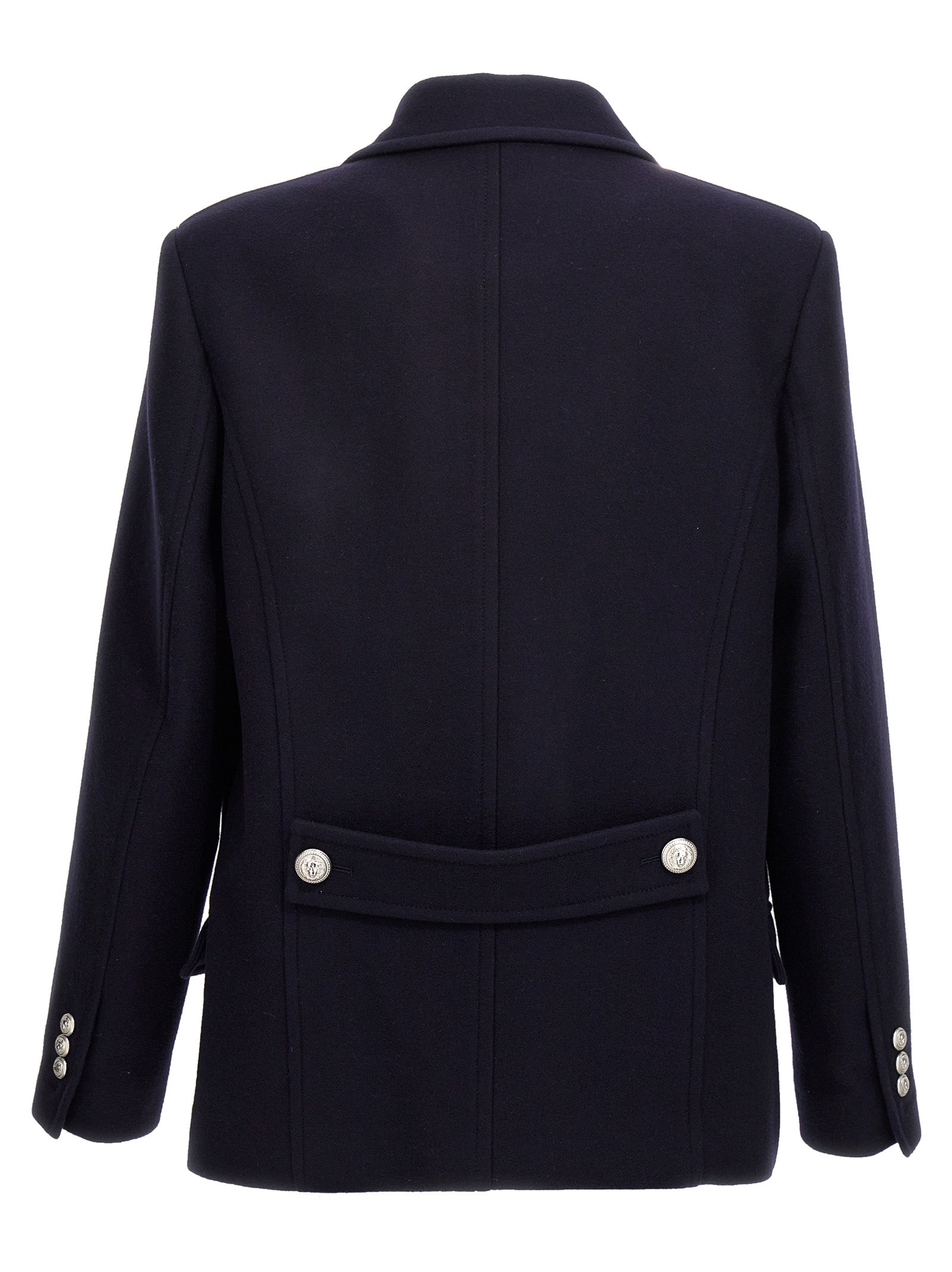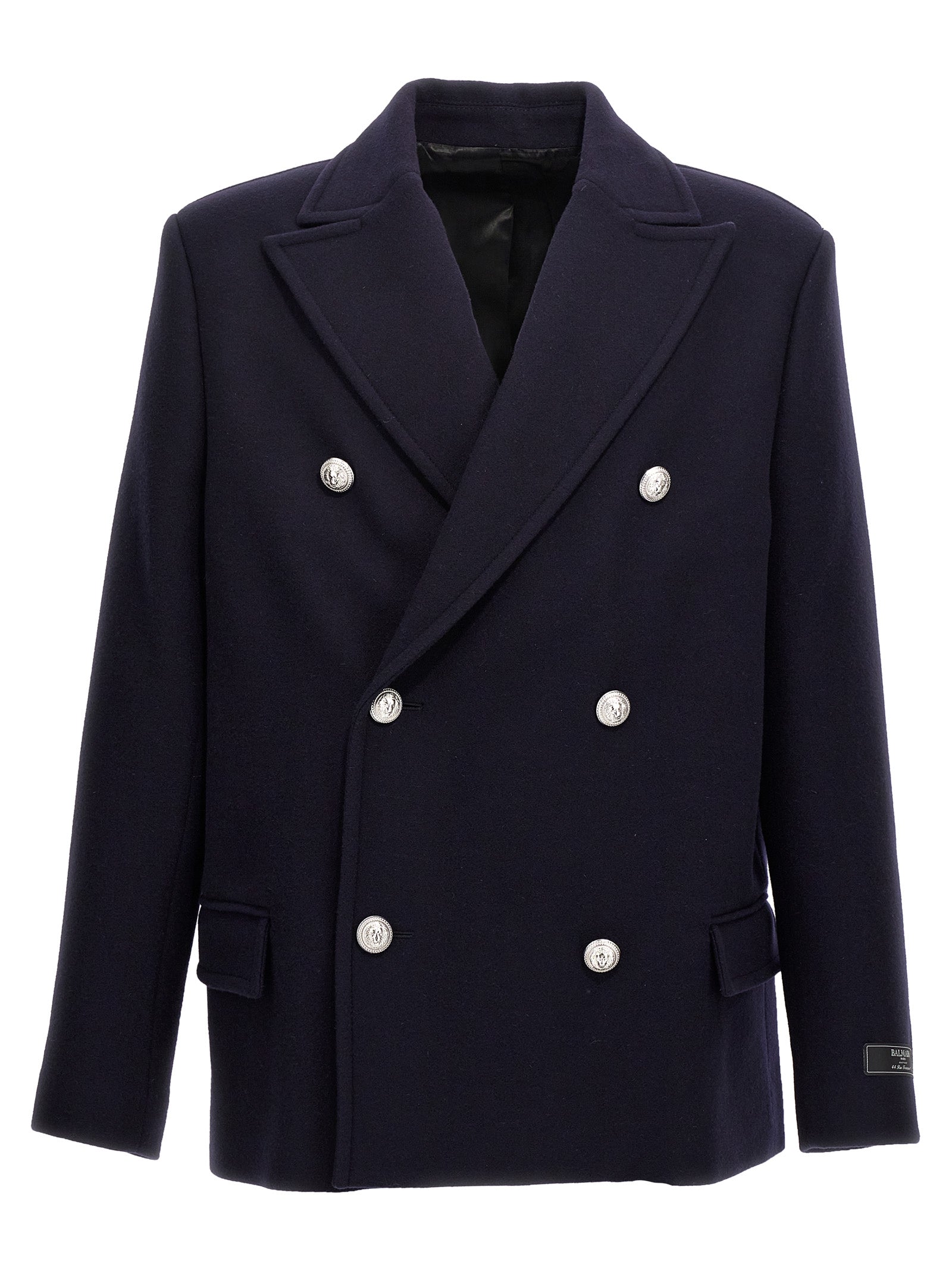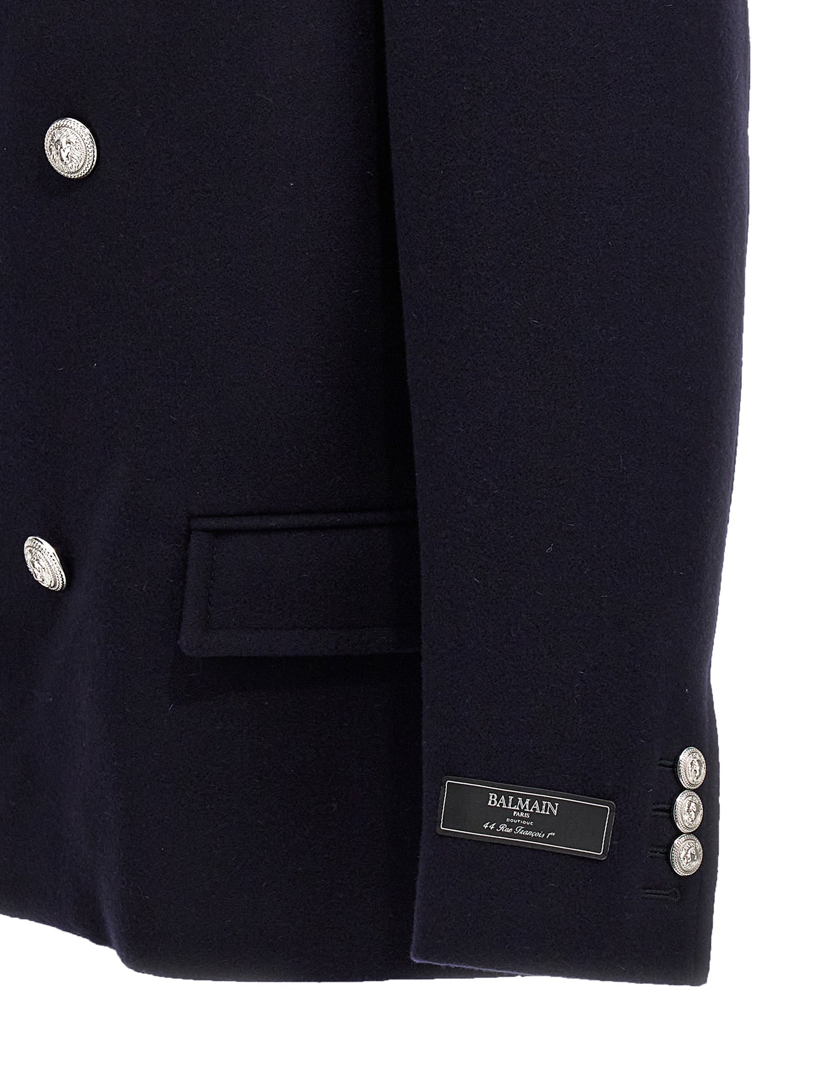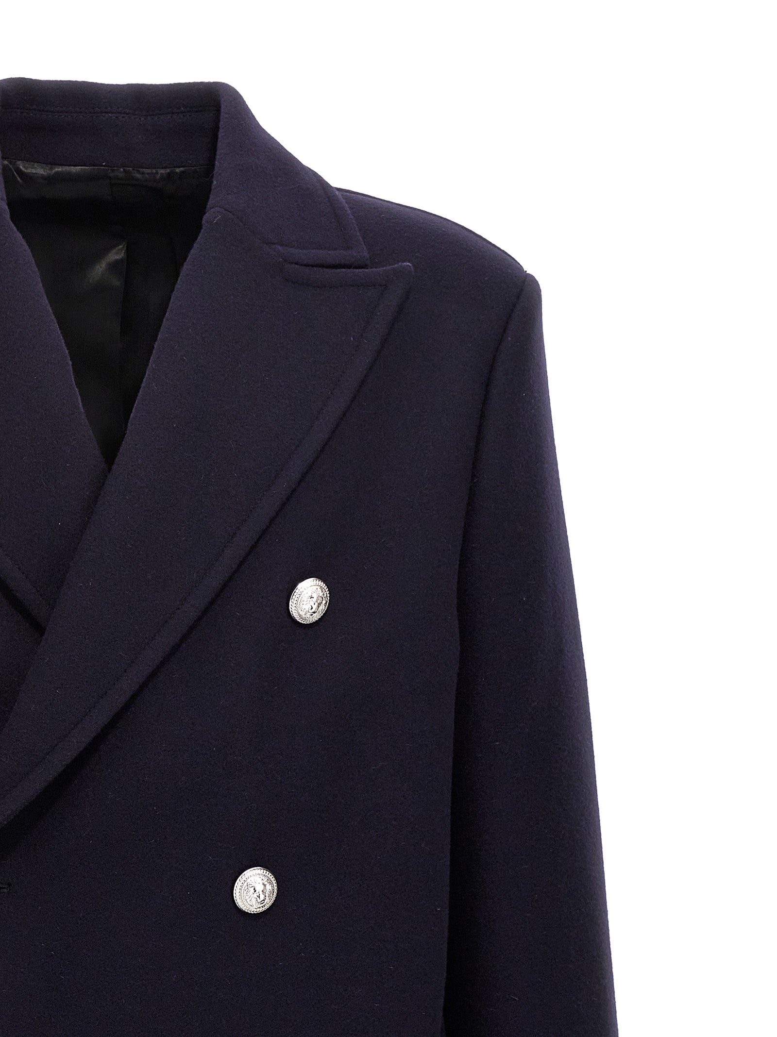 Double-breasted wool felt coat, logo button closure, pockets, long sleeves, back half belt.