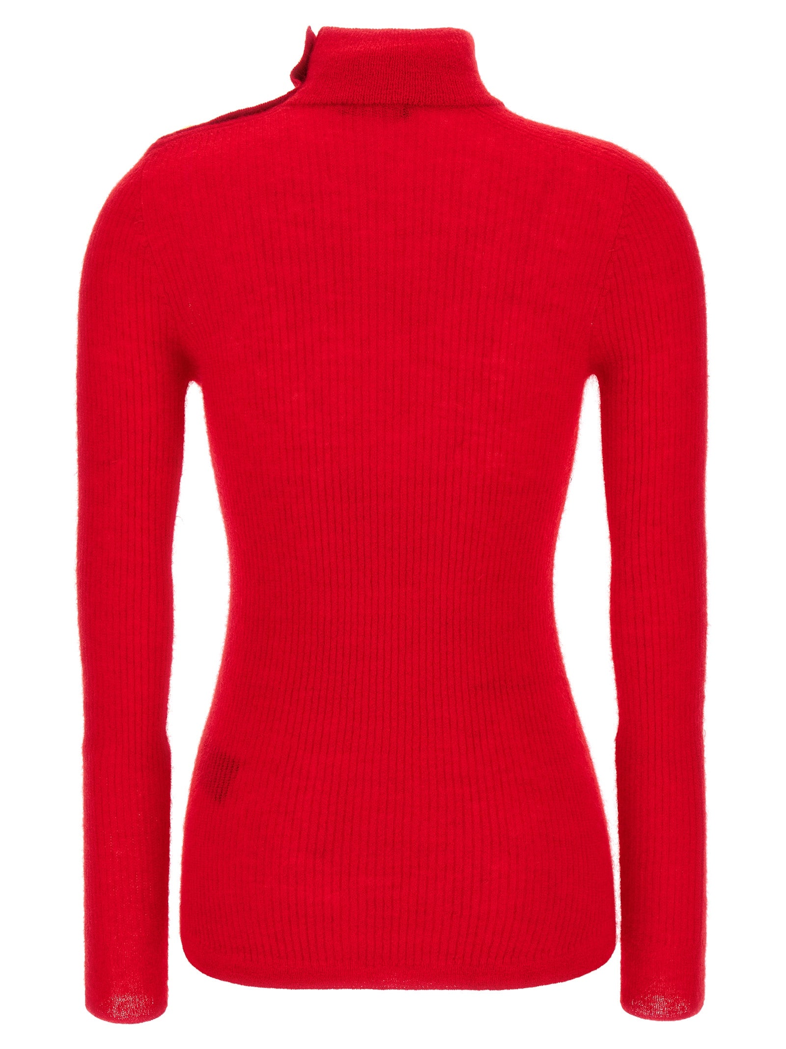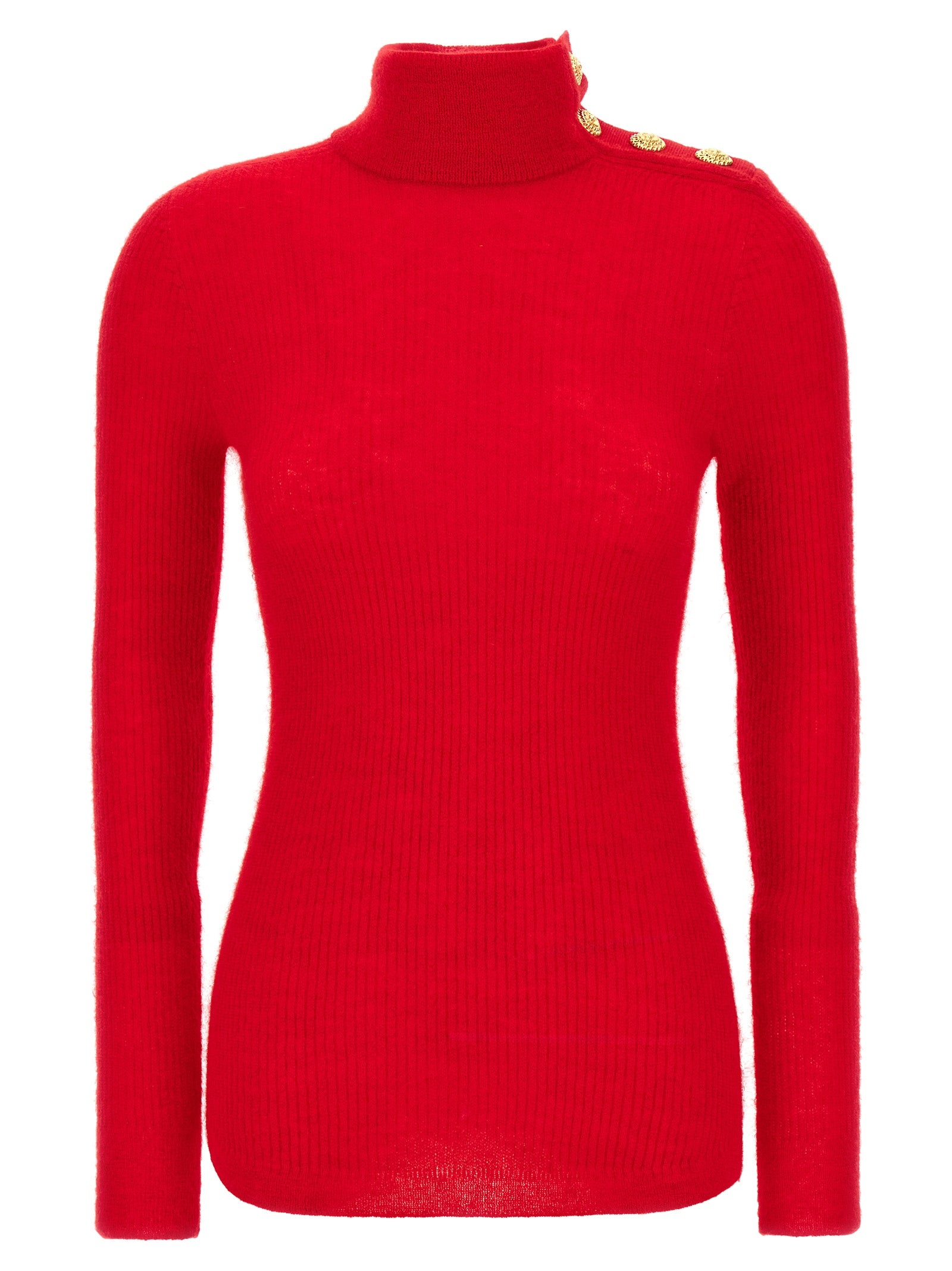 Mohair blend sweater, high neck, buttons on the shoulder, long sleeves.
