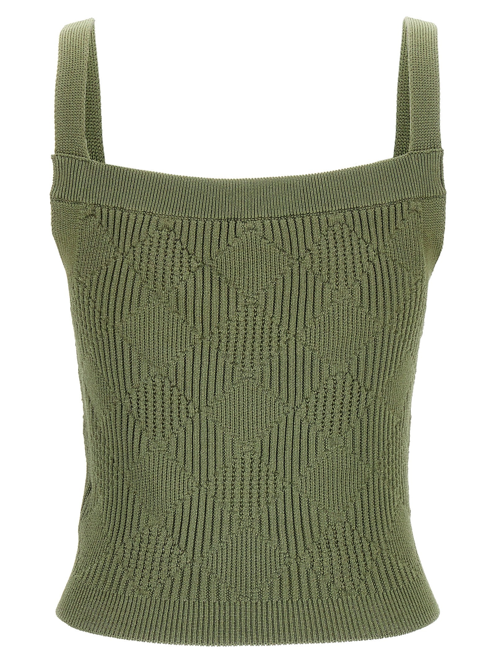 Top in perforated viscose blend knit with square neckline, gold metal button appliqué.