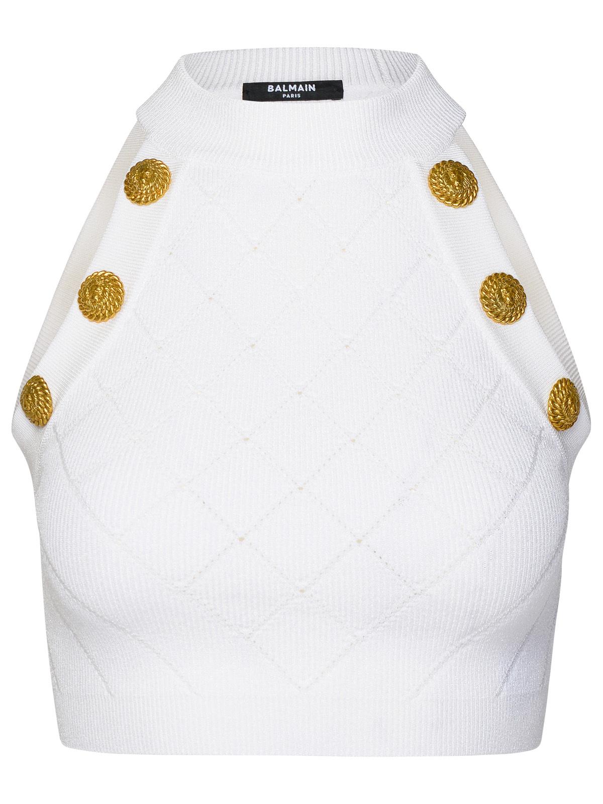 Fine diamond knit top, tight fit, ribbed crew neck, armholes, six embossed gold metal buttons, ribbed trims.