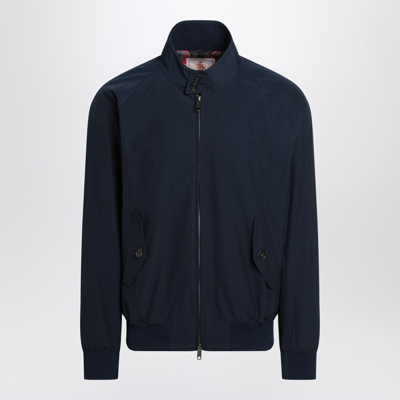 Navy blue cotton blend bomber jacket by Baracuta, featuring a front closure with double zip, long sleeves, raised collar with buttons, two side pockets with flap and button, ribbed knit edges, and slim fit.