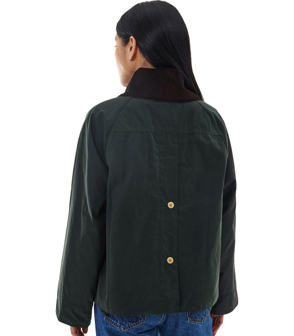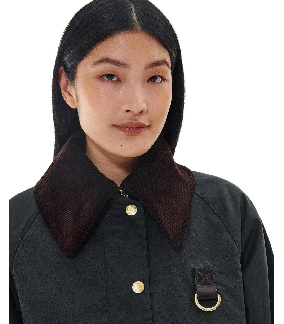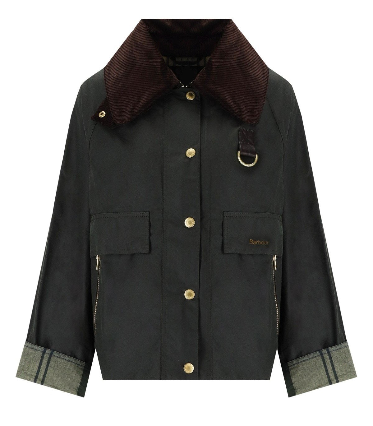 Barbour's Sage Green Catton Wax Jacket, made from waxed cotton, features an oversized brown ribbed collar. It has zip and flap pockets, an embroidered logo on the front, and cuff sleeves with a tartan pattern detail. It fastens with a zip and buttons. The fit is relaxed. Composition: 100% waxed cotton. Lining: 65% polyester, 35% cotton. Trimmings: 100% leather.