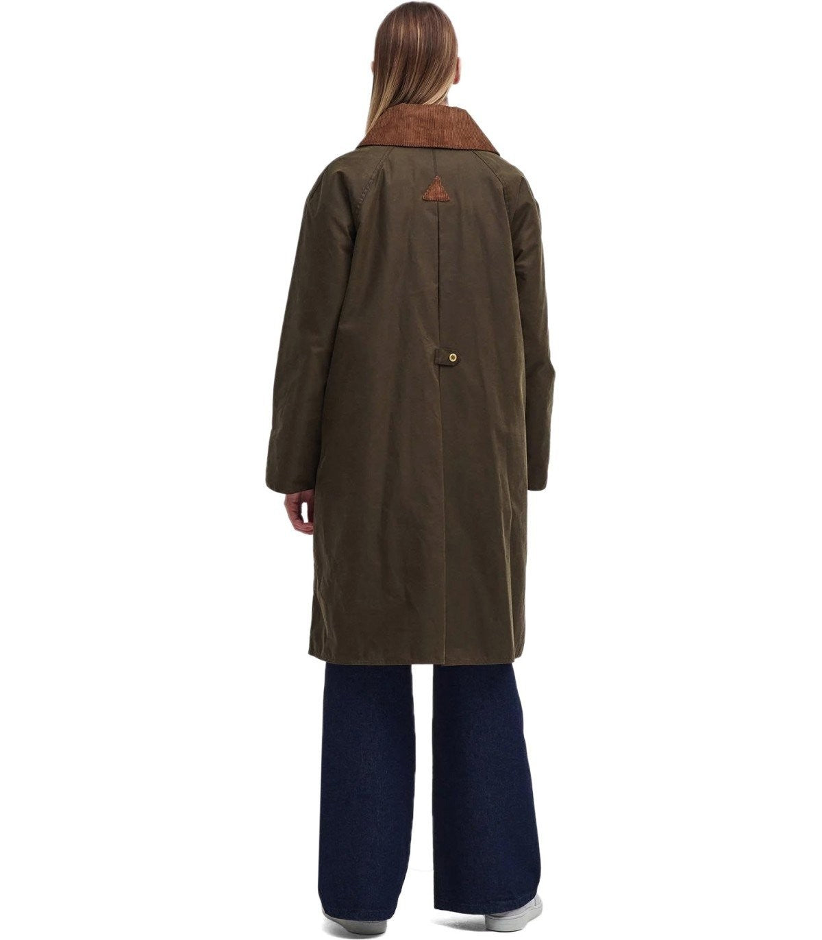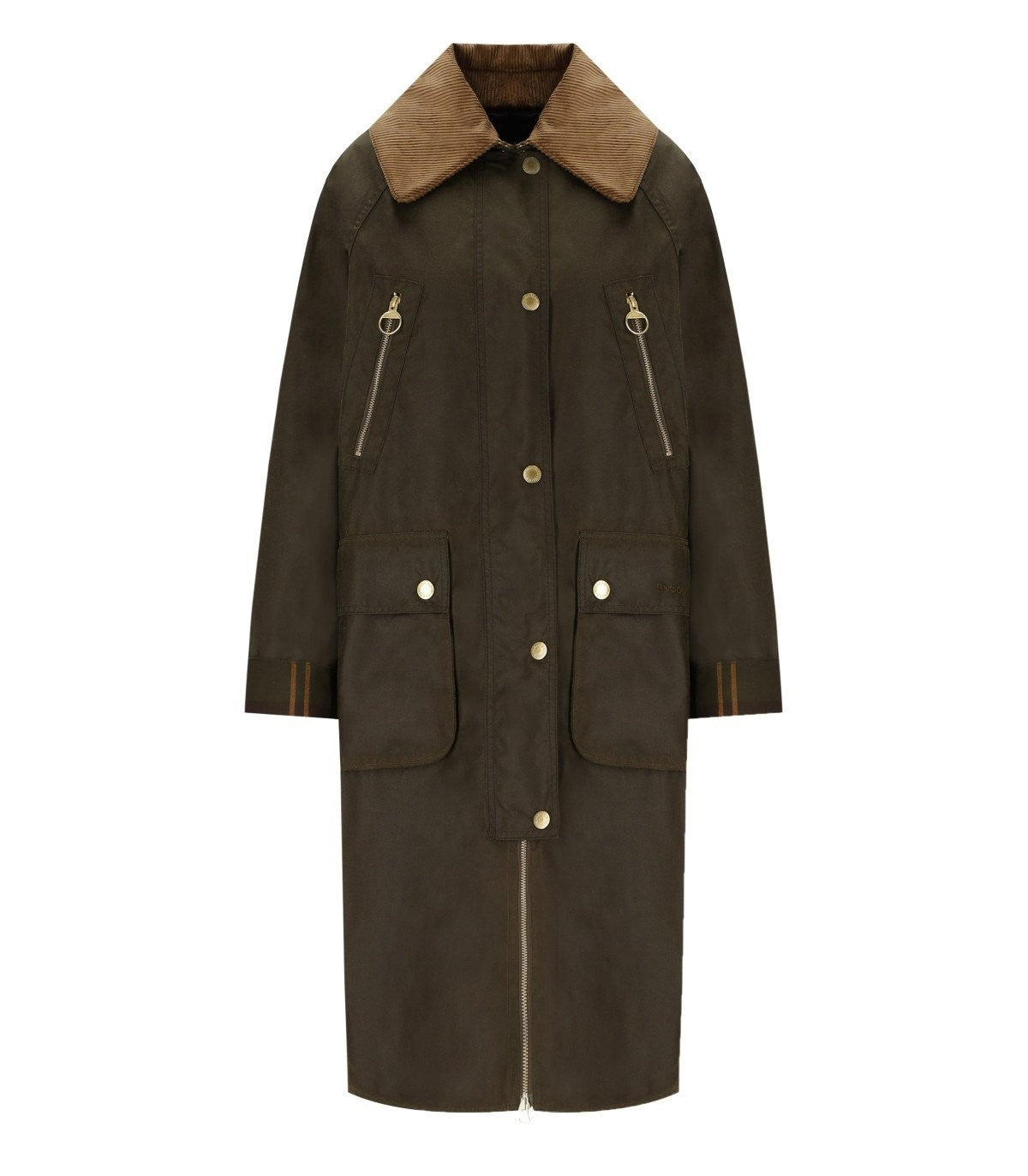 Ebberston jacket by Barbour made of waxed cotton in forest green. Characterized by an oversized ribbed collar, it features a back vent. Enhanced with gold zip buttons, it has a tartan lining. Outer composition: 100% cotton (waxed). Inner back panel: 65% polyester, 35% cotton. Lining: 100% cotton. Collar: 100% cotton. Sleeve lining: 100% 170 g Sylkoil polyester.