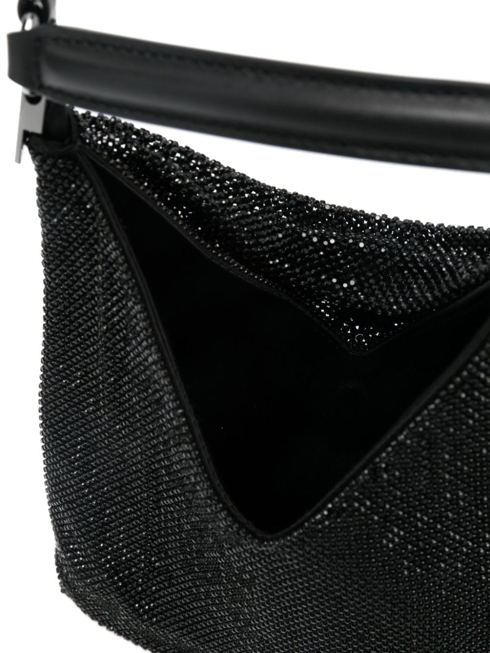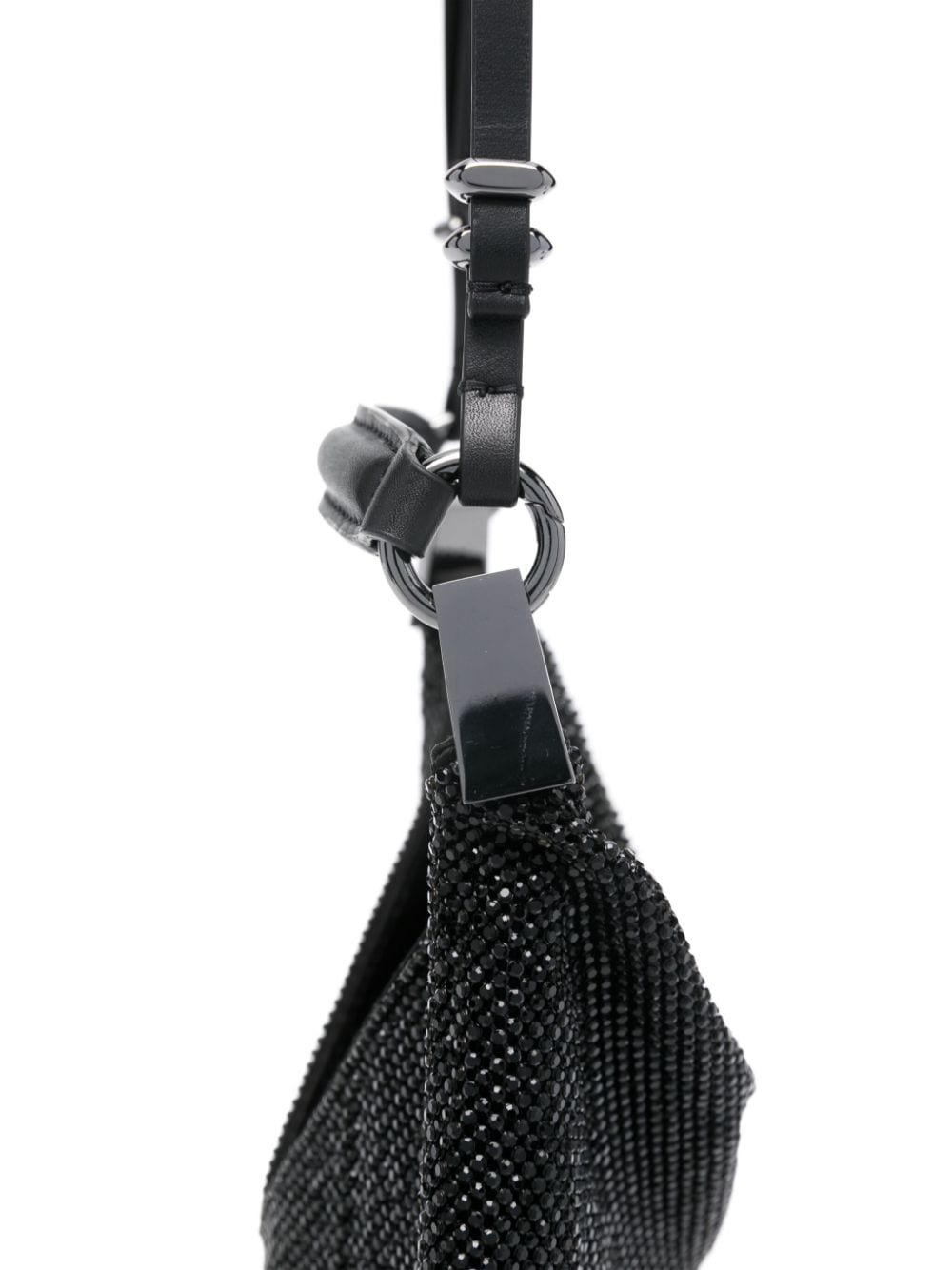 black crystal embellishment concealed magnetic fastening single detachable top handle adjustable detachable shoulder strap draped design satin lining main compartment internal logo tag This piece comes complete with a protective dust bag.