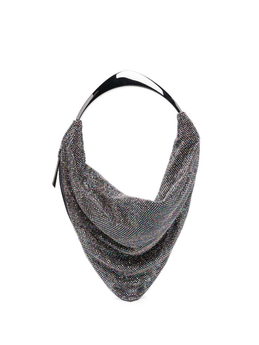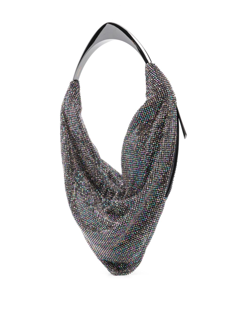 Ursula rhinestone-embellished tote bag from BENEDETTA BRUZZICHES featuring silver-tone, silk lining, rhinestone embellishment, draped design, single shoulder strap, top zip fastening and main compartment.