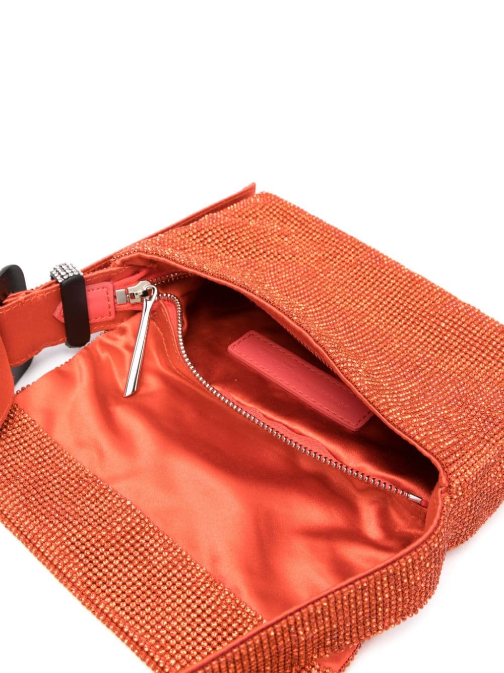 lava orange silk rhinestone embellishment crystal buckle detail adjustable shoulder strap foldover top main compartment internal logo patch internal zip-fastening pocket satin lining