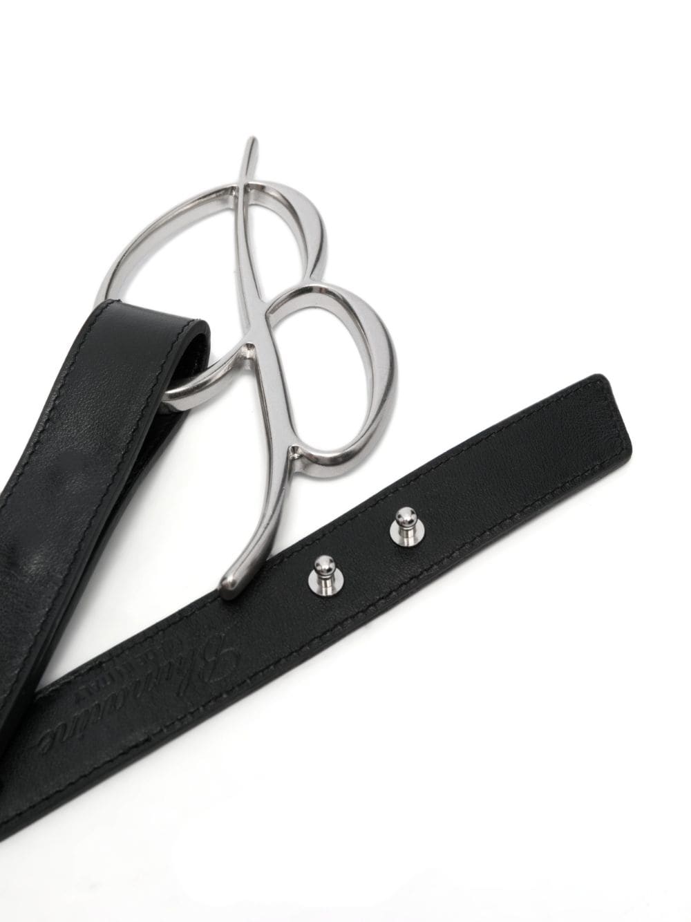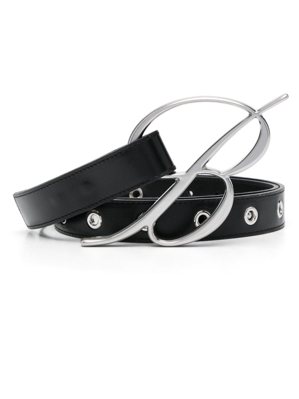logo-buckle leather belt from BLUMARINE featuring calf leather, logo buckle fastening, silver-tone hardware, punched holes and adjustable fit.