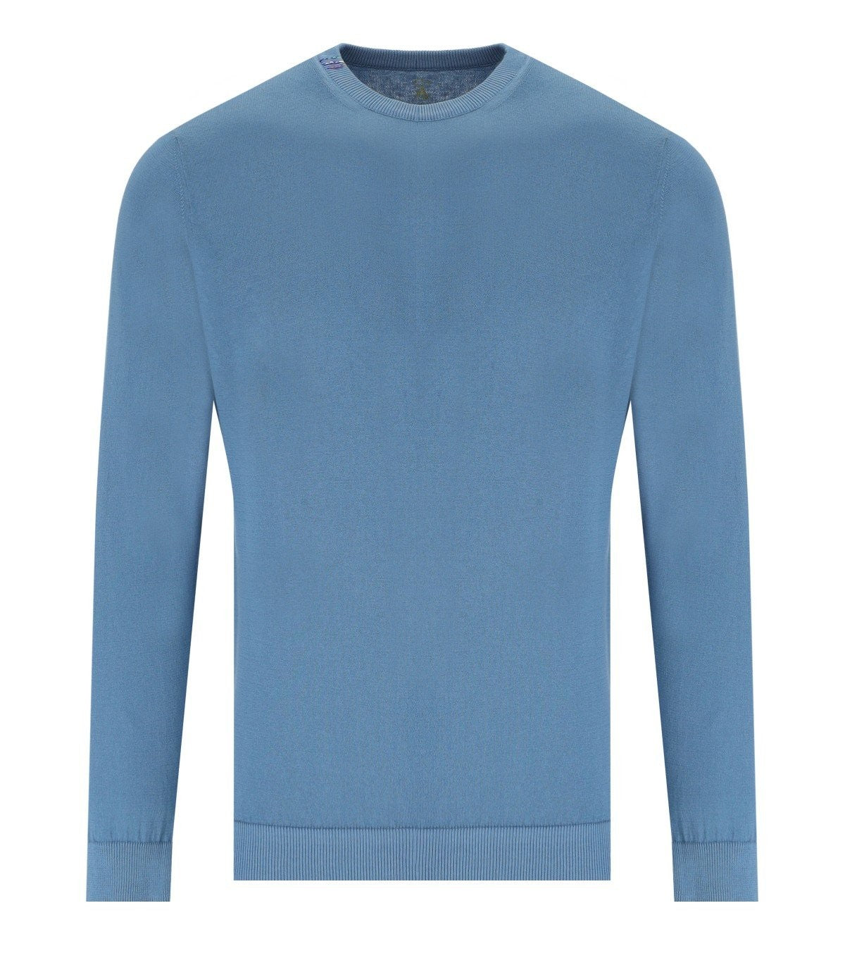 Round neck sweater Chall by Bob made of cotton in shades of blue. Ribbed collar, cuffs and hem. Slim fit. This item has a small fit, we recommend purchasing one size larger than usual. Composition: 100% cotton.