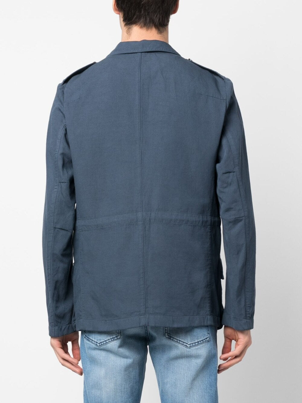 pocket-detail single breasted jacket from BOGLIOLI featuring navy blue, cotton-linen blend, notched lapels, front button fastening, long sleeves, internal drawstring fastening waist, straight hem, two chest flap pockets and two side flap pockets.