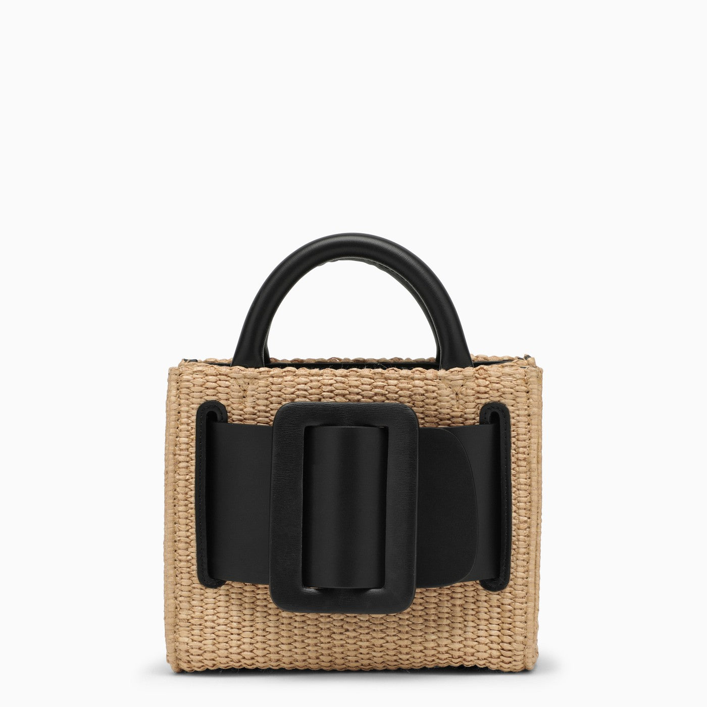 Handbag in beige and black raffia by BOYY, featuring a maxi buckle on the front, two top handles, an inside flat pocket and a removable shoulder strap.