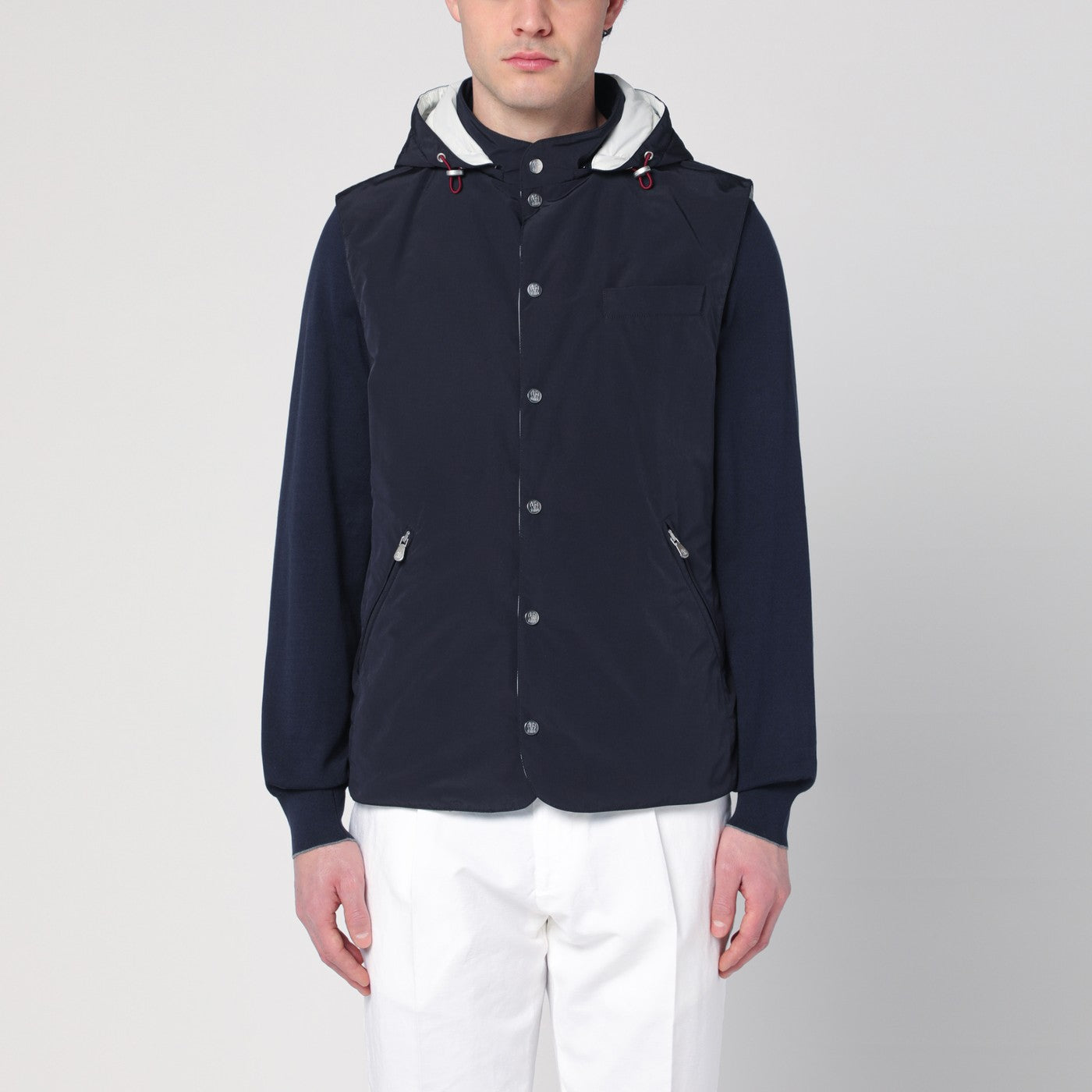 Brunello Cucinelli gilet in ocean blue nylon blend, featuring a front closure with branded buttons, two zip pockets on the front, a removable drawstring hood, and a raised collar.