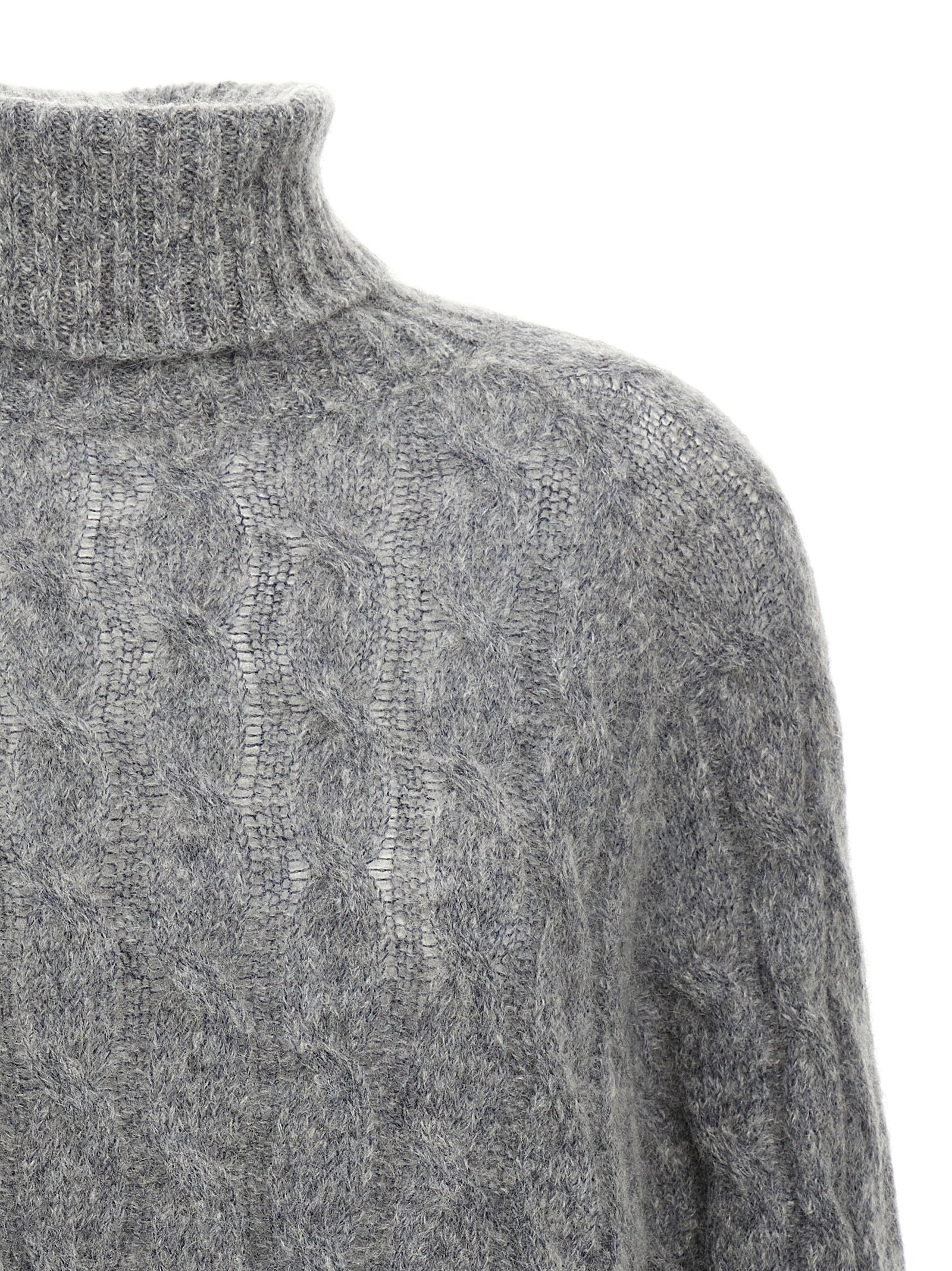 Braid sweater in wool and mohair blend, with high neck, long cuffed sleeves.