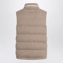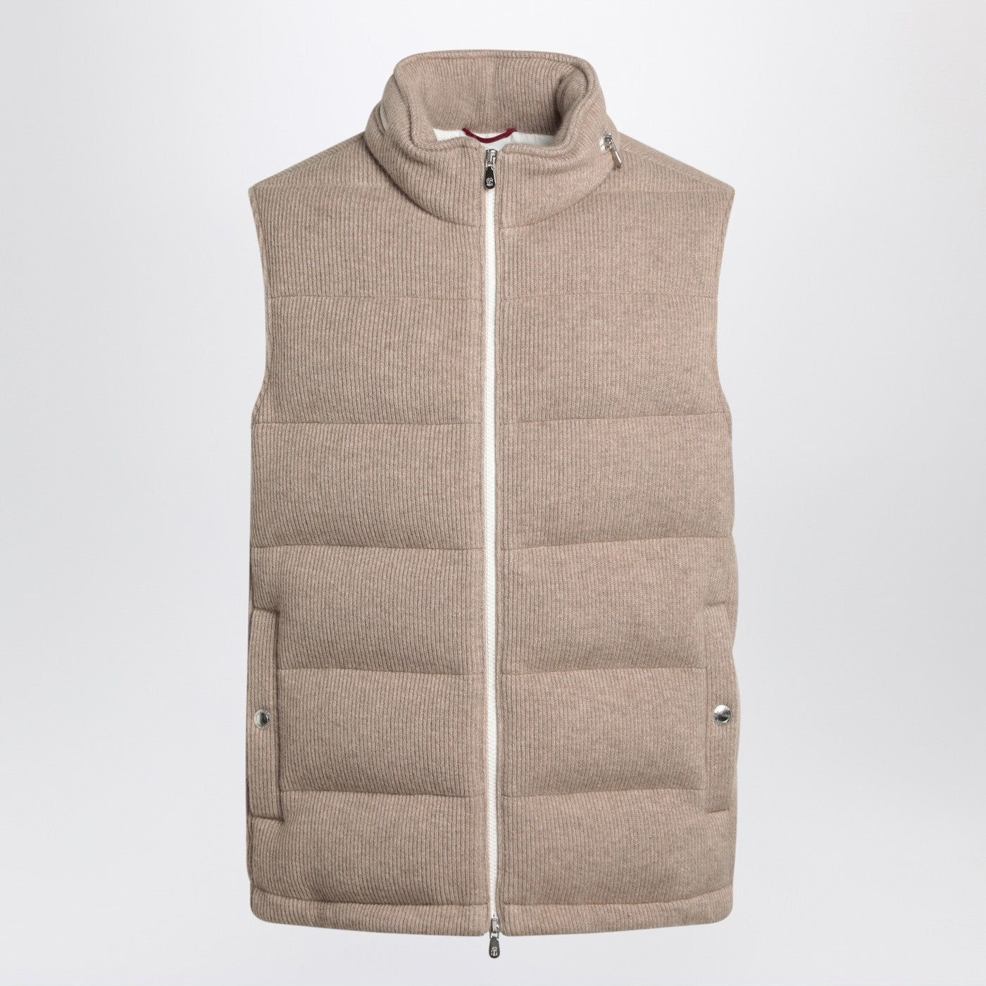 Sand coloured cashmere padded gilet by Brunello Cucinelli, featuring a stand-up collar, ribbed knit, double zip front fastening, two side welt pockets with button, removable hood, water-repellent nylon lining and drawstring hem.