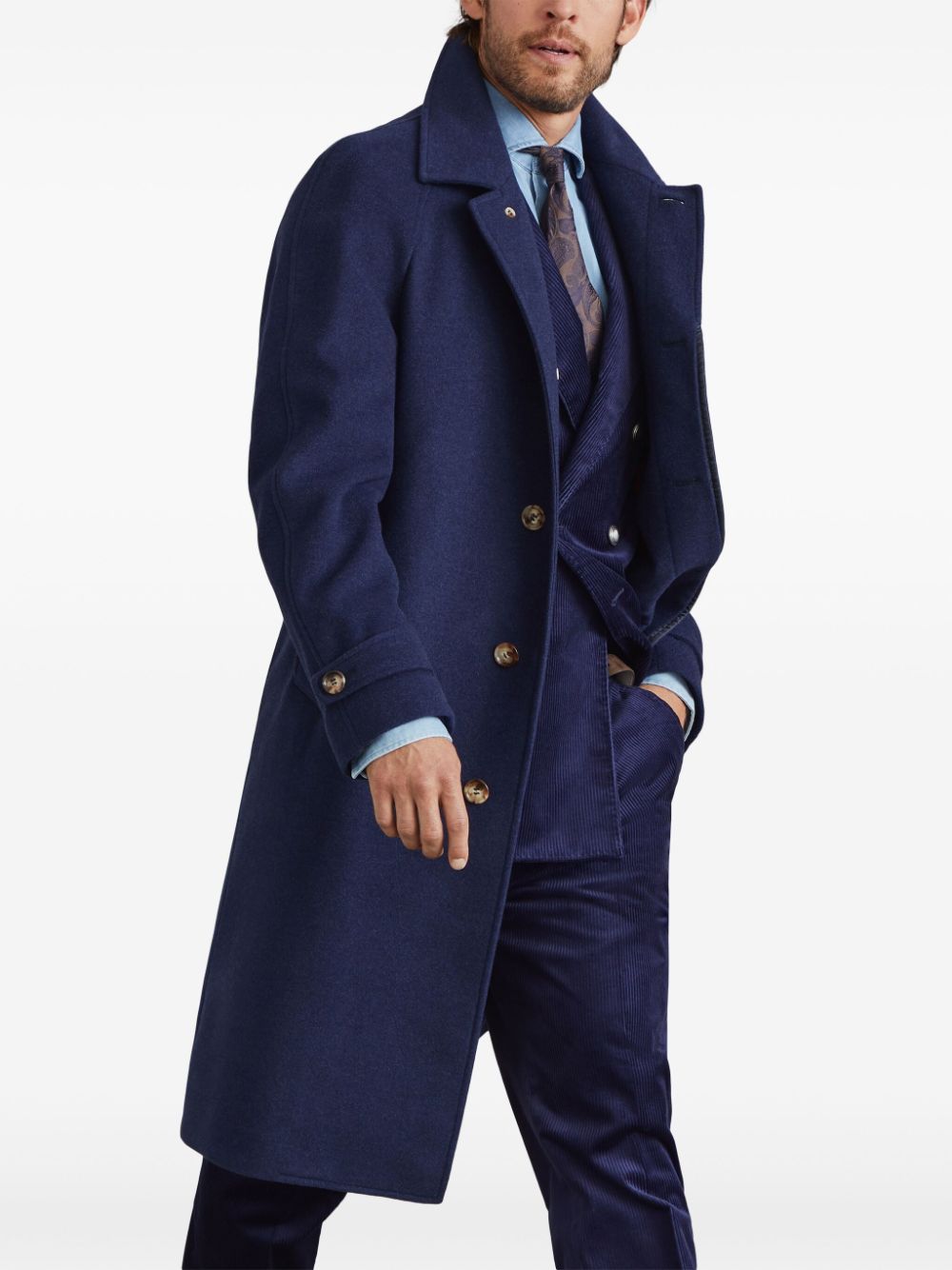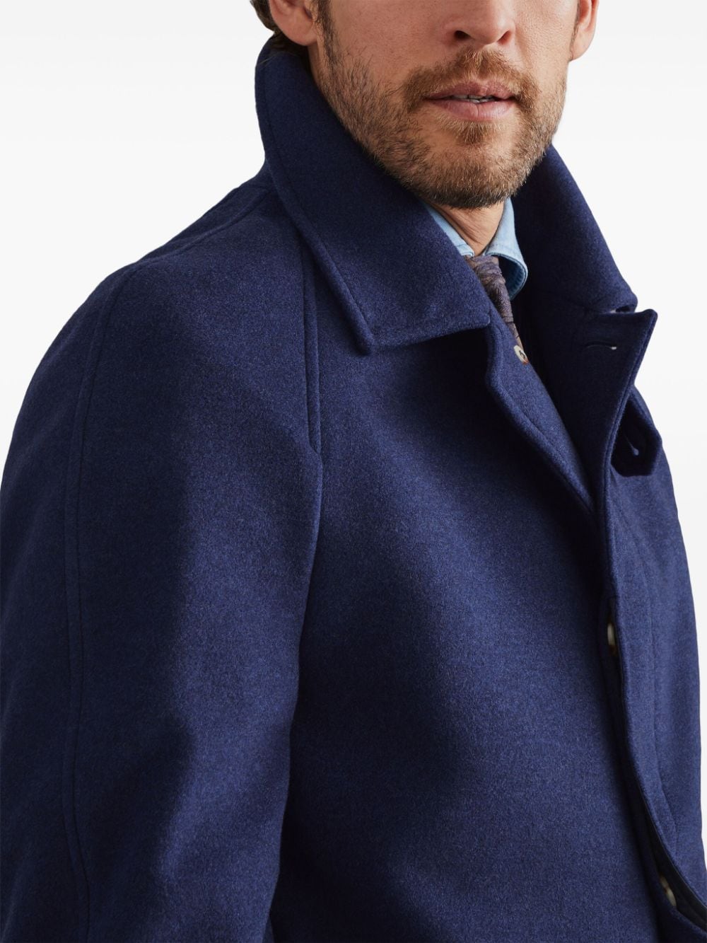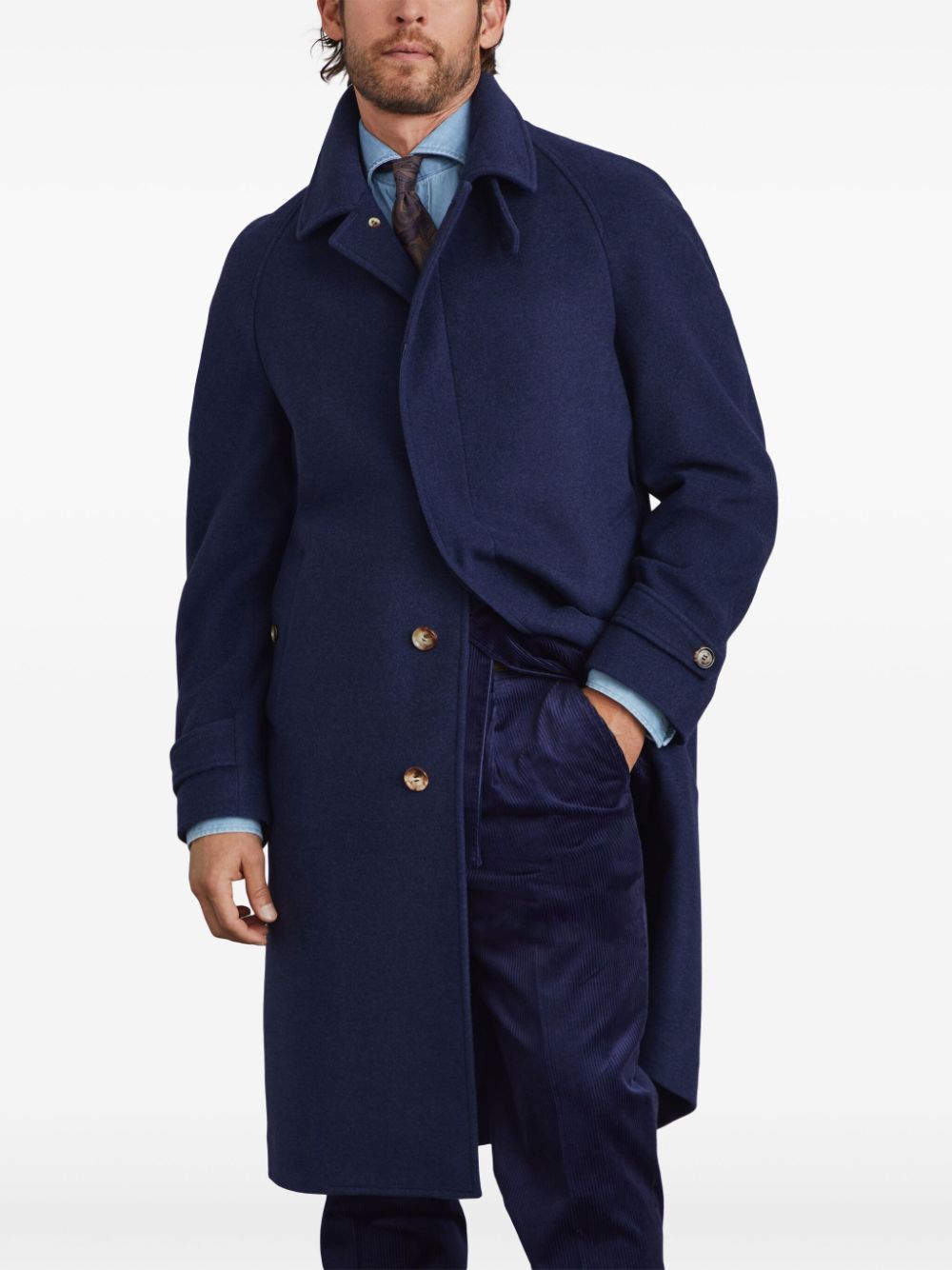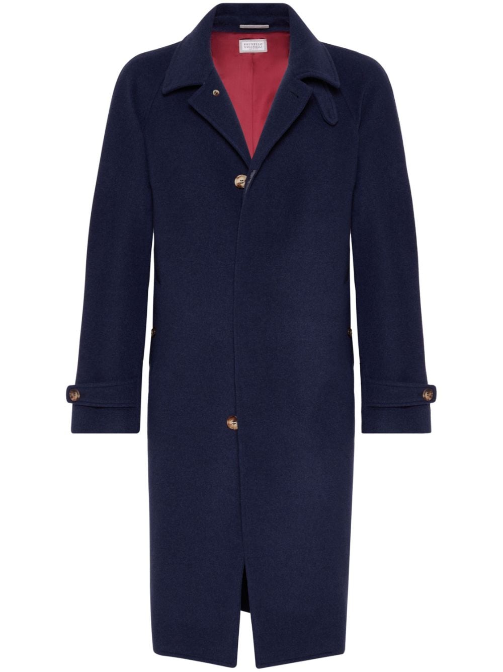 navy blue cashmere felted notched collar long raglan sleeves with belted cuffs two side button-fastening pockets storm flap English rear vents straight hem concealed front button fastening