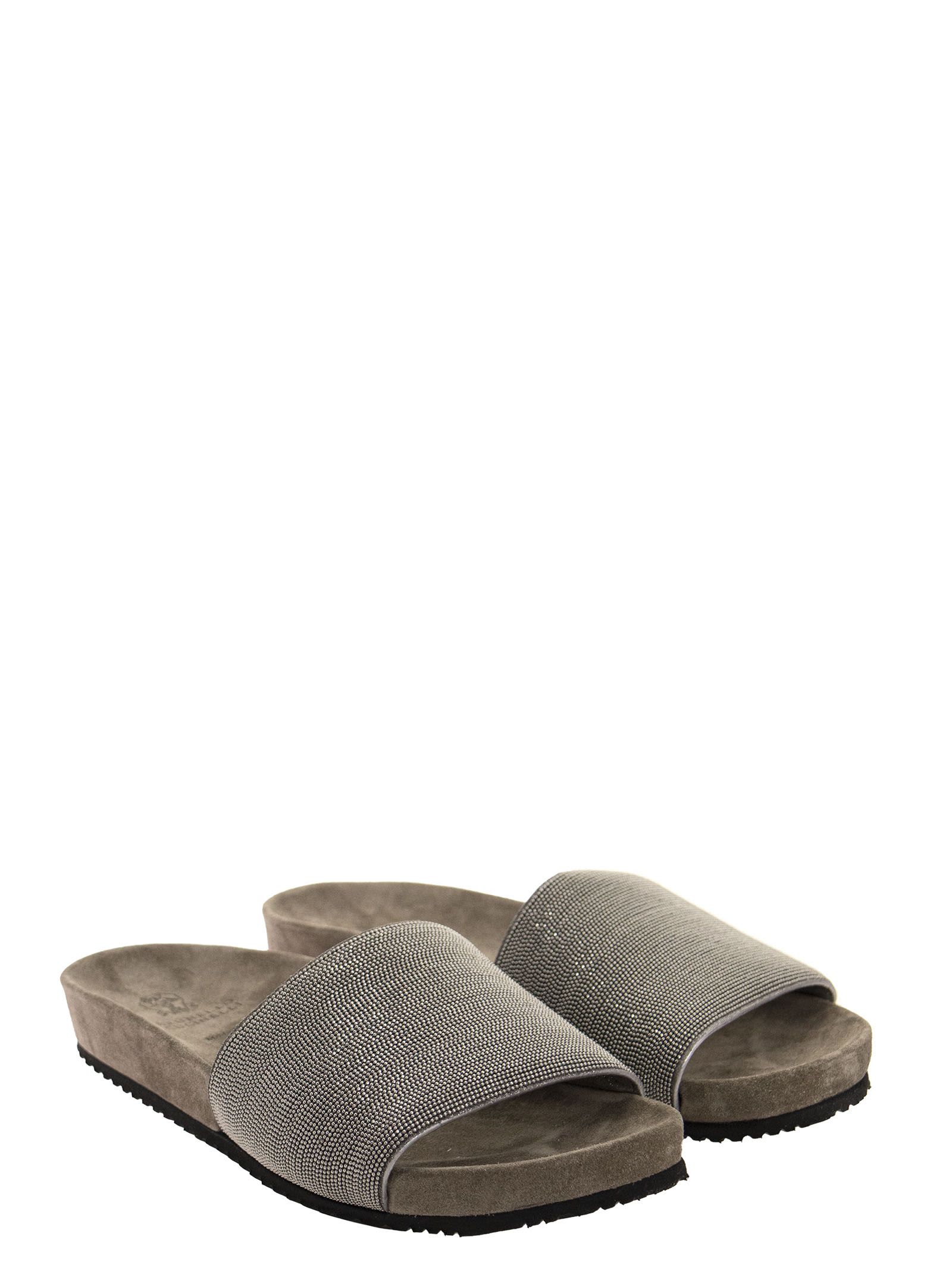 The iconic embellishment of the Brunello Cucinelli collections elevates the essential style of these new slides. The leather band is entirely embroidered in rows of shiny monili to create a precious texture that will illuminate a look with a sparkling touch. A leather covered footbed and a rubber tread provide added comfort. - Leather lining - Sole in lightweight micro rubber - TPU rubber tread - Nickel-free monili decoration DESIGNER ID: MZMIG1390 C6351