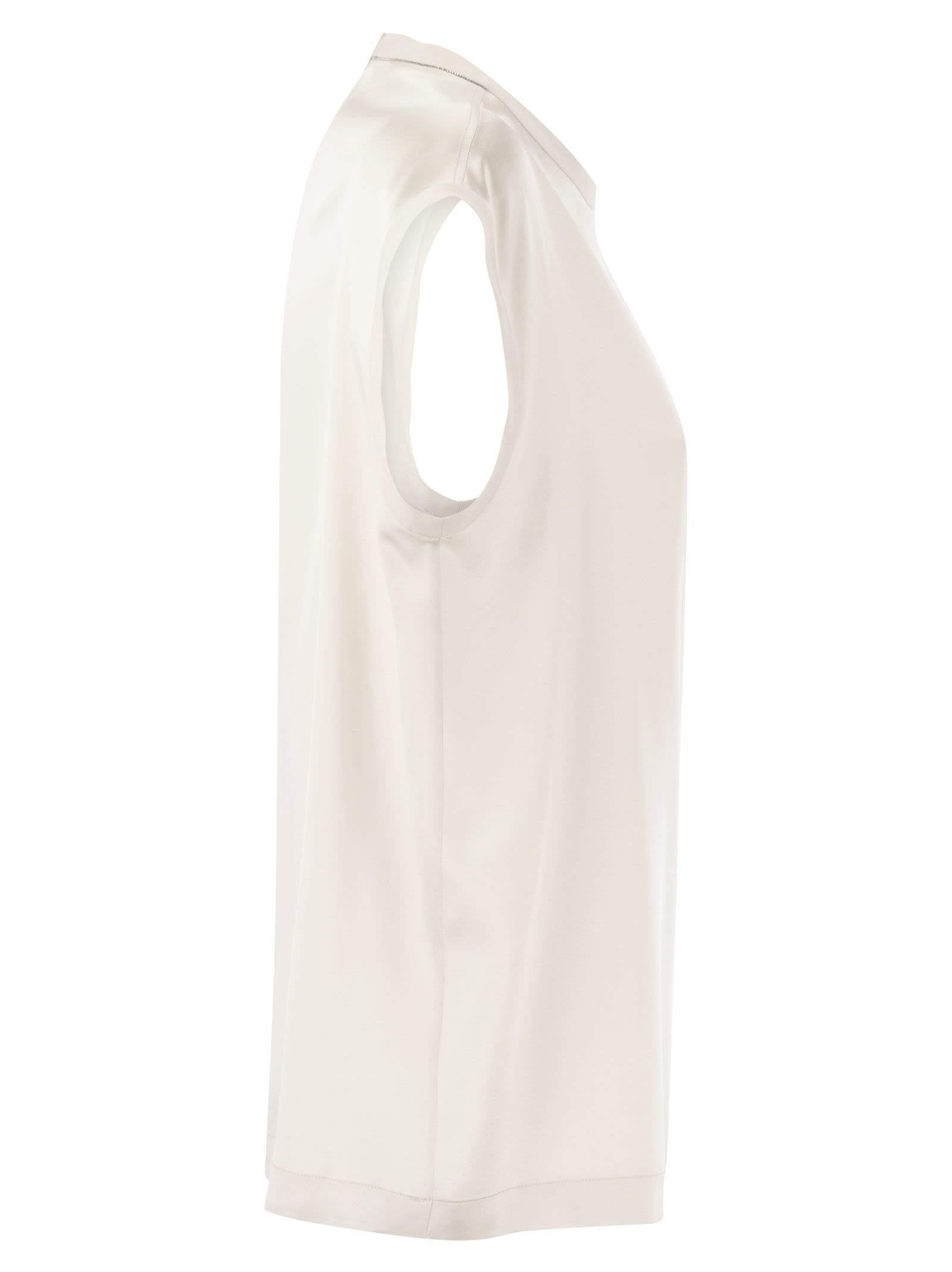 The iconic decoration of the Brunello Cucinelli collections enriches the essential and versatile style of the sleeveless t-shirt. The edges of the V-neck at the front are enriched by an embroidery insert with rows of shiny jewels, creating an elegant contrast of textures with the silk base. A loose fit offers proportions that remain close to the body. - V-neckline - Back closure DESIGNER ID: M0C59EH500 C9443