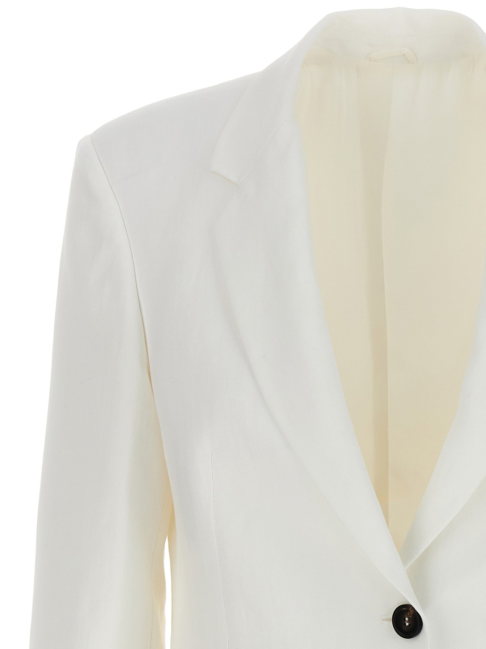 Single-breasted blazer in viscose linen blend with button closure, pockets, back vents, long sleeves.