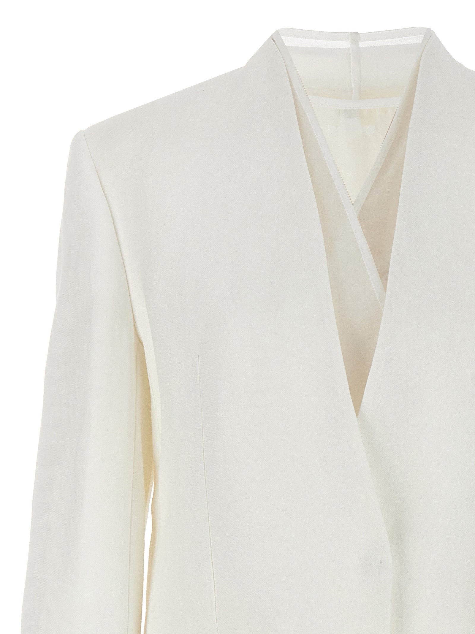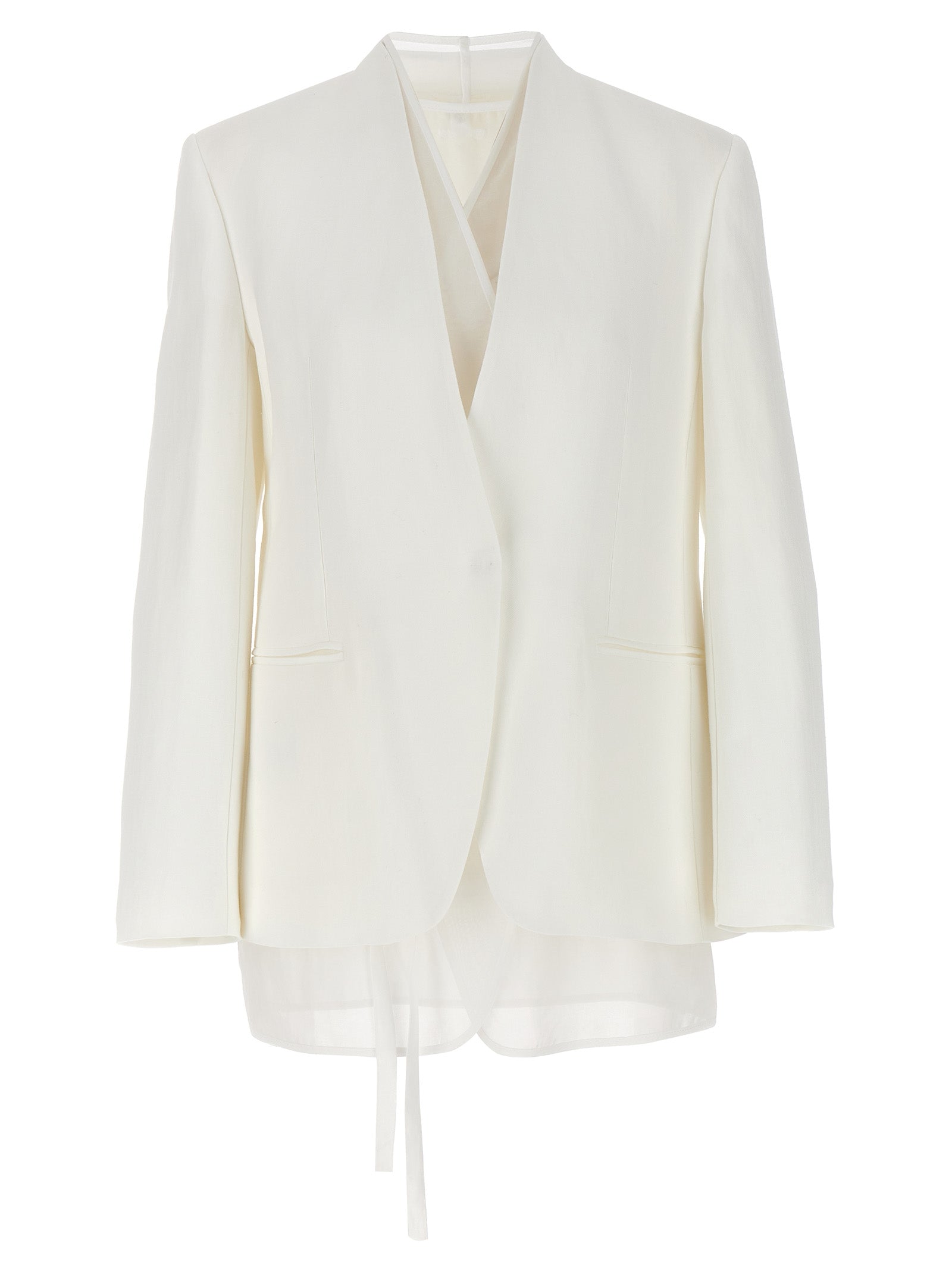 Single-breasted viscose and linen blazer with button closure, pockets, long sleeves, removable organza vest insert.