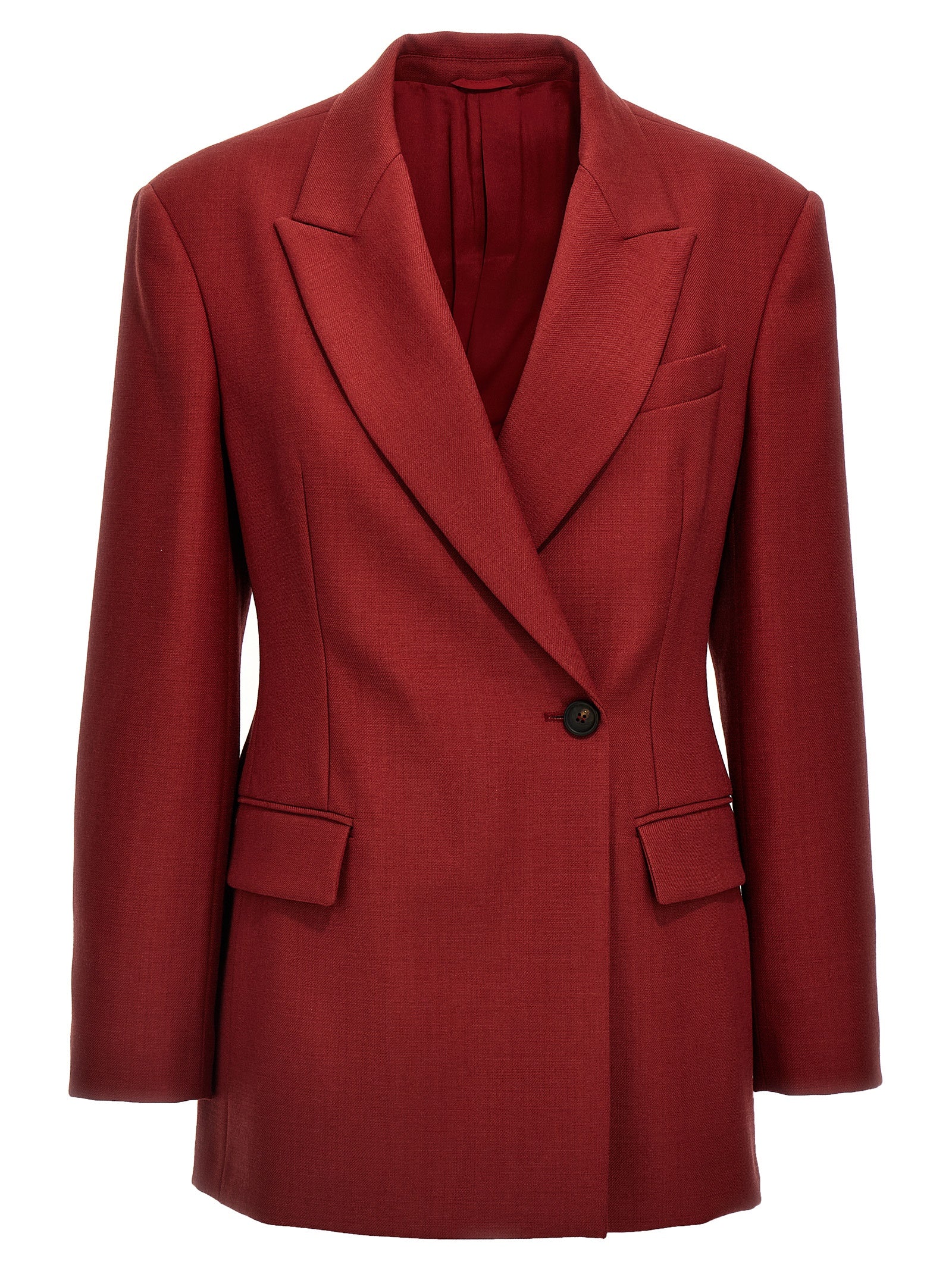 Single-breasted wool blazer with silk blend lining, peak lapels, button closure, long sleeves, pockets, back vent.